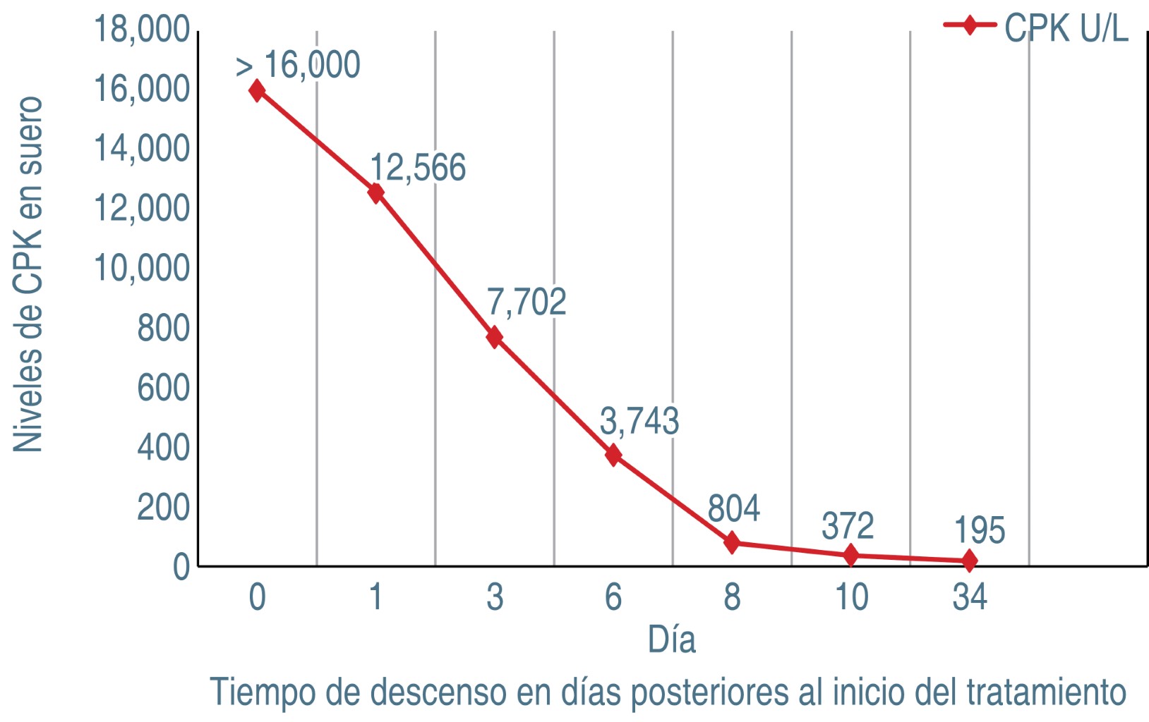 Por el estado neurológico del paciente, caracterizado por pobre control del tono muscular y de sus movimientos, así como por los resultados de los estudios de laboratorio, se llegó al diagnóstico de un ED grado IV.4 Se adicionó levodopa/carbidopa 250/25 mg a una dosis inicial 3 mg/kg/día por vía enteral, hasta llegar a 10 mg/kg/día, así como clonazepam (dosis inicial 0.03 mg/kg/día, hasta llegar a 0.05 mg/kg/día) y lorazepam (1 mg/kg/día). Además, de manera conjunta con el servicio de rehabilitación, terapia física y ocupacional, se establecieron indicaciones para mejorar el tono muscular, el posicionamiento y la modulación de reflejos. Con esta terapéutica se logró mejoría de las posturas distónicas y disminución significativa de los niveles de CPK (Figura 1); posteriormente, el paciente regresó a su condición neurológica basal.