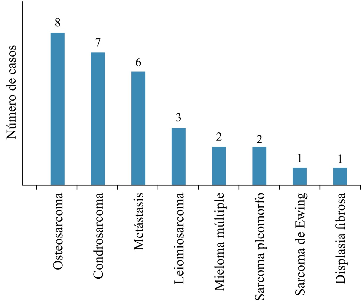 La pelvis y el fémur proximal fueron las regiones afectadas con mayor frecuencia (Tabla 1), siendo la localización izquierda en 60% de los pacientes y derecha en 40% restante. En cuanto al diagnóstico anatomopatológico (Figura 1), el tumor más frecuente fue el osteosarcoma (ocho casos), seguido del condrosarcoma (siete casos) y los tumores metastásicos (seis casos). Al diagnóstico, cinco pacientes (16.1%) presentaban alguna lesión metastásica en otra localización, mientras que el resto (83.9%) no presentaban afectación a distancia. Un total de cinco pacientes (17.9%) presentaban una fractura patológica en el momento de la cirugía y seis pacientes (23.1%) habían sido sometidos a cirugías previas en relación con la misma lesión.