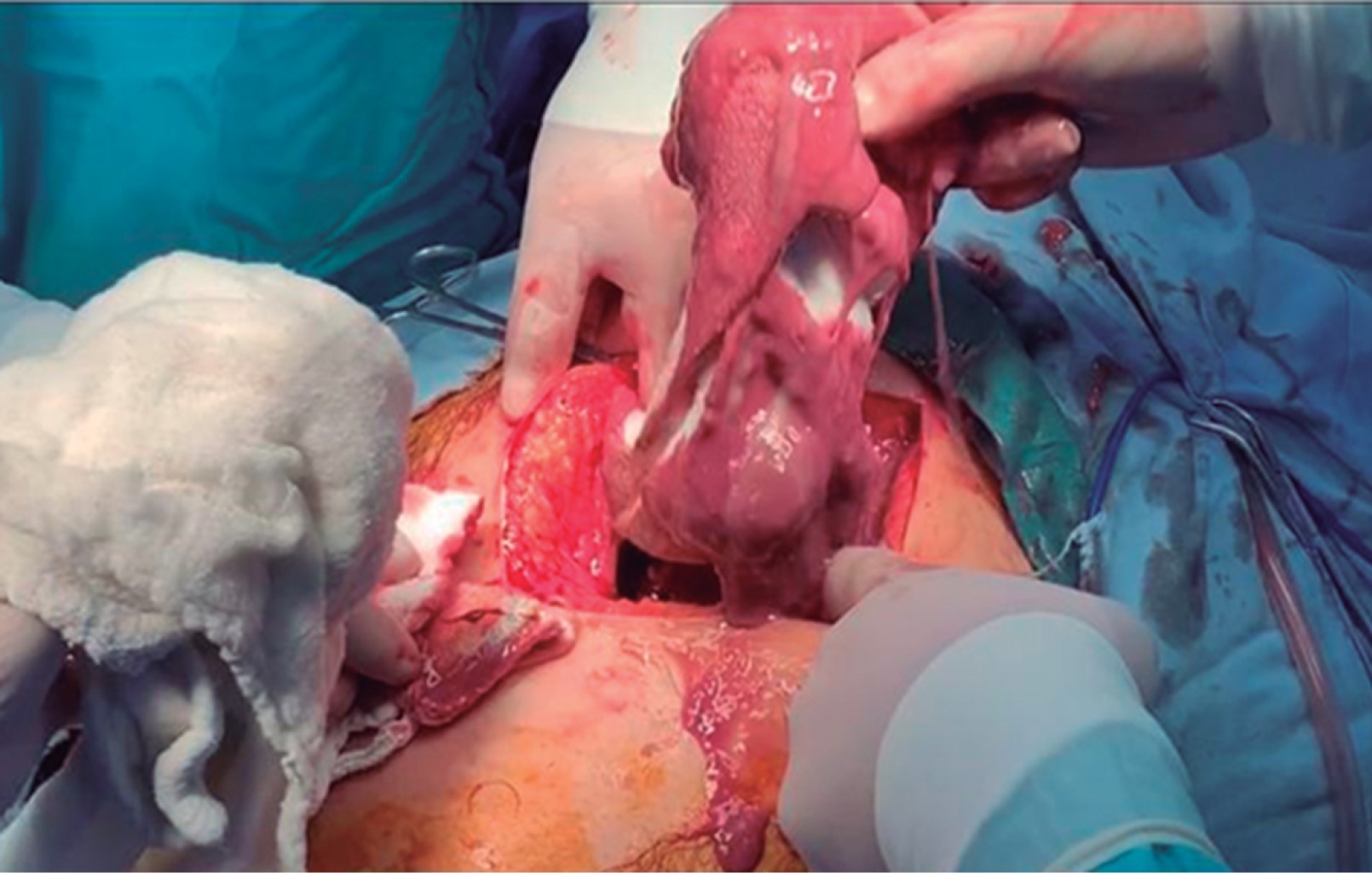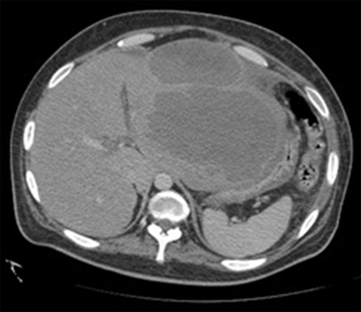 Se realizó una radiografía anteroposterior (AP) de tórax, en la cual se visualizó un derrame pleural izquierdo que cubría más de 50%. La tomografía computarizada mostró una importante cantidad de líquido en el espacio pleural izquierdo que condicionó una atelectasia pasiva del lóbulo inferior (Figura 1); el hígado se encontró con densidad heterogénea con incremento del lóbulo hepático izquierdo secundario a la presencia de una lesión heterogénea hipodensa con bordes lobulados, que muestra un reforzamiento periférico y de algunos septos internos, la cual abarca los segmentos II, III, IVa y IVb midiendo aproximadamente 20 × 14.5 × 12.5 cm (Figura 2), condicionando desplazamiento posterior y compresión del estómago y del páncreas y desplazamiento caudal de las asas intestinales (Figuras 3 y 4). En el polo inferior del lóbulo hepático derecho adyacente al segmento IV se identifica una lesión de aspecto quístico homogéneo con reforzamiento periférico tras la administración de contraste intravenoso, midiendo en sus ejes mayores 25 × 27 × 13 cm. Como manejo inicial se le colocó una sonda Foley y sonda nasogástrica presentando gasto de características gástricas (30 ml). Se colocó un catéter central, verificado por radiografía. Se solicitaron estudios de imagen. Se le indicó ayuno, se inició fluidoterapia, antibioticoterapia con ceftriaxona y metronidazol, manejo del dolor, control glucémico y protector gástrico. Al visualizar la imagen del derrame pleural izquierdo, se decide realizar una toracocentesis, obteniendo exudado espeso de aspecto "chocolatoso". Al momento de contar con la tomografía se inicia tratamiento quirúrgico urgente.