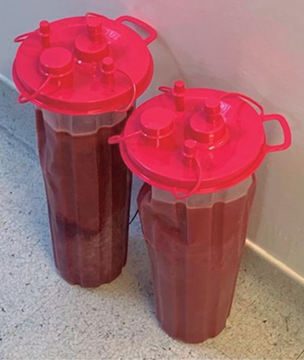 Se coloca sonda endopleural izquierda obteniéndose gasto de características serosas en cantidad de un litro, Al realizar la cirugía se encuentra absceso hepático roto a cavidad peritoneal, obteniéndose cerca de tres litros de líquido purulento hemático con aspecto de "pasta de anchoas" (Figura 5). Se visualiza cápsula del absceso localizada en lóbulo hepático izquierdo segmentos 2, 3 y 4 de aproximadamente 10 cm de diámetro que se extiende hacia diafragma sin llegar a invadirlo (Figura 6). Se realiza lavado exhaustivo de cavidad peritoneal sin encontrar afección a órganos vecinos colocando drenaje saratoga dirigido a la cápsula del absceso y drenaje de Penrose dirigido a hueco pélvico (Figuras 5, 7 y 8).