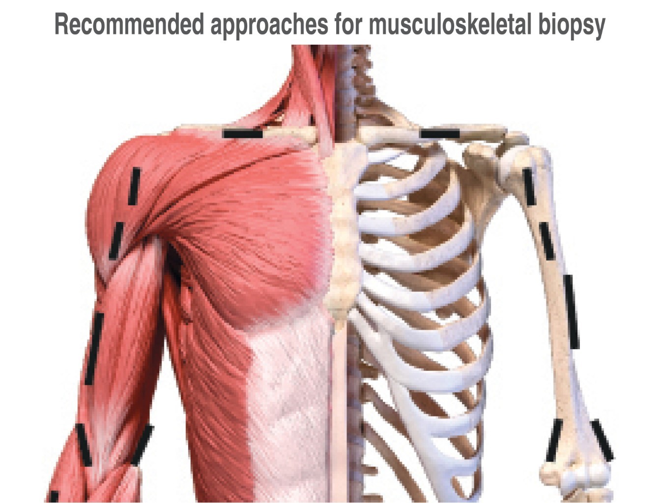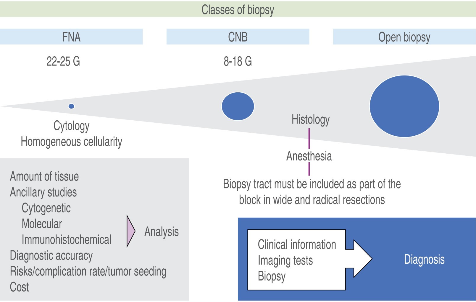 Antes de realizar una biopsia musculoesquelética estamos obligados a analizar cuidadosamente los elementos clínicos, de laboratorio y de imagen de nuestros pacientes. Una vez obtenida y analizada esta información debemos generar un diagnóstico de presunción que nos permita planear adecuadamente la biopsia. Para tal efecto debemos considerar el tratamiento probable y el abordaje quirúrgico de éste; con base en ello, elegir la vía de acceso correspondiente. El tipo de biopsia depende del panorama clínico, del diagnóstico de presunción y de la experiencia de los integrantes del equipo multidisciplinario relacionado a cada caso.