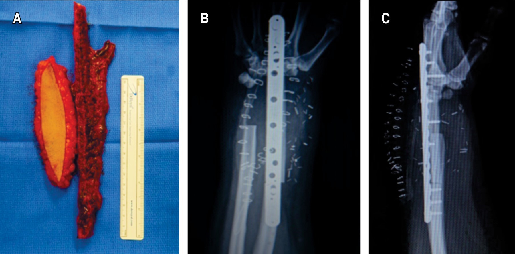 Dado el grado funcional que presenta esta región, la reconstrucción del radio distal continúa siendo un desafío y aún no existe una técnica definida como estándar de oro,5 por lo que se han desarrollado múltiples técnicas quirúrgicas tales como artrodesis parcial o total de muñeca y artroplastia de muñeca con ayuda de aloinjertos, impresiones en 3D o colgajos óseos vascularizados y no vascularizados.6-9