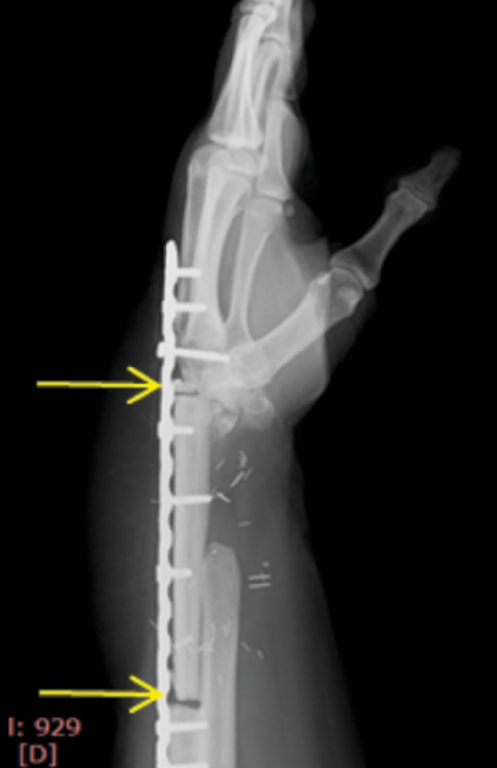 El seguimiento postoperatorio se llevó a cabo con controles radiográficos mensuales, se colocó una férula antebraquipalmar y se inició rehabilitación en la segunda semana. Sin embargo, al sexto mes persistía con dolor a nivel de la muñeca y el antebrazo, limitación funcional (pronación 90o, supinación -10o), debilidad (grip strength 50%, menor que el contralateral), con un puntaje DASH de 62.5, radiográficamente presentaba datos de no unión proximal y distalmente al peroné (Figura 4), misma que se decidió tratar de forma quirúrgica debido al tiempo de evolución.