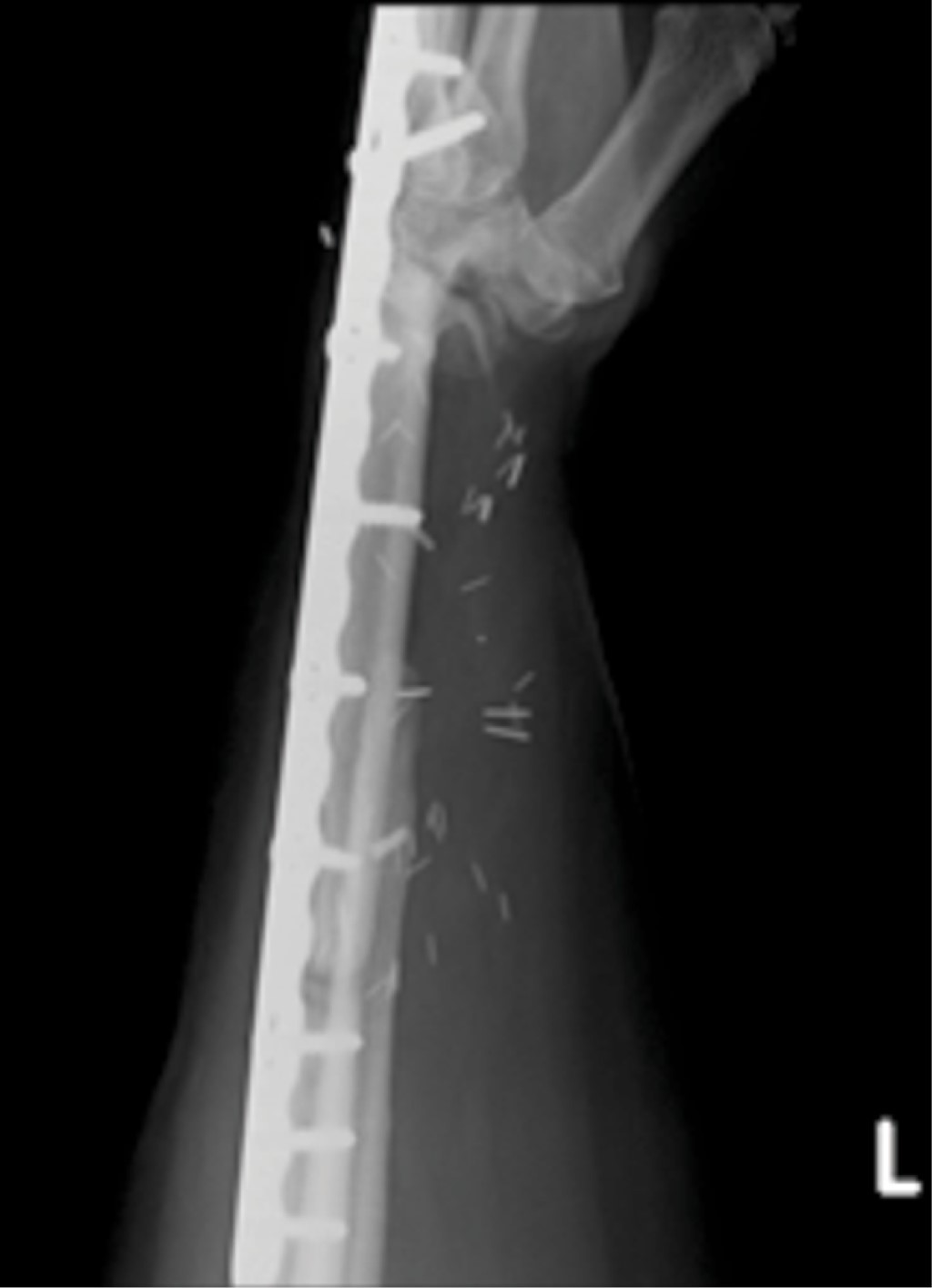Presentamos el caso de una mujer de 45 años, sin antecedentes crónico degenerativos de importancia, que acude por presentar dolor en muñeca izquierda, con el antecedente de una fractura patológica de radio distal izquierdo en septiembre de 2018, tratada con reducción abierta y fijación interna con placa de radio distal volar y matriz ósea, actualmente consolidada. De inicio se realizó radiografía posteroanterior y lateral de la muñeca observando una lesión neoplásica en radio distal compatible con un tumor de células gigantes en un estadio III de la clasificación de Campanacci (Figura 1), se complementó el protocolo de estudio con tomografía de tórax descartando metástasis pulmonares y posteriormente se decidió como tratamiento la resección en bloque (Figura 2) (5 cm a la superficie articular proximal tanto de radio como de cúbito y se incluyó la fila proximal del carpo, todo a través de un abordaje dorsal) y reconstrucción inmediata con peroné vascularizado y artrodesis de muñeca con una placa de compresión bloqueada (Figura 3).