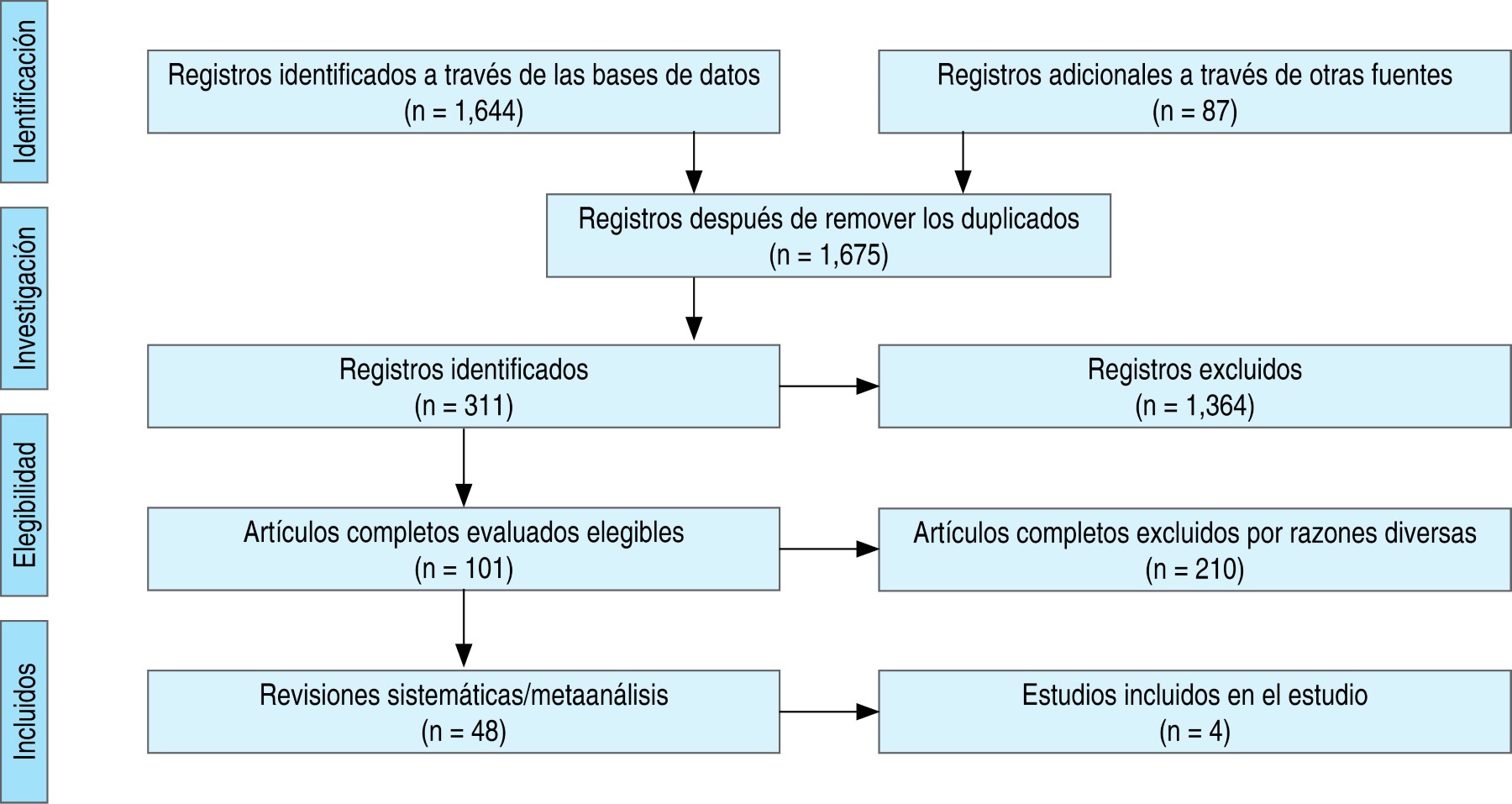 El proceso de investigación en las bases de datos para la selección de publicaciones se muestra en la Figura 1 y permite identificar 1,644 artículos y 87 adicionales. Los textos completos de 48 RS, MA y RS/MA son revisados luego de evaluar los títulos y el resumen de las publicaciones; y cuatro RS y RS/MA publicadas en el año 2019 cumplen con los criterios de inclusión y son el material de revisión de la evidencia.15-18 Incluyen 45 investigaciones, 31 practicadas en adultos, 12 en niños y dos en población mixta con mayoría adultos; 27 son ECA, 24 en adultos; un estudio cuasi-ECA en adultos; siete estudios retrospectivos, cuatro en adultos; y 10 estudios prospectivos de cohorte, cuatro en adultos. Cada RS/MA evalúa el riesgo de sesgo en cada uno de los ensayos y es variable por criterios variables empleados para su calificación y diferente categoría. En la intervención se emplearon cinco esquemas diferentes de TABx de administración intravenosa (IV) y seis esquemas de administración vía oral (VO), ambos por periodos variables.