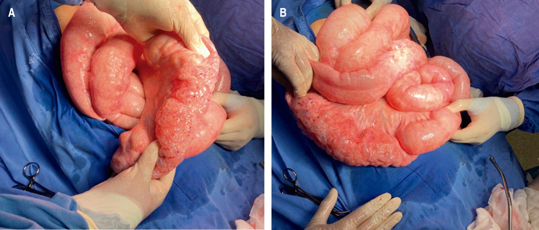 Se presenta el caso de paciente femenino de 61 años, la cual acudió al servicio de urgencias con distensión, dolor abdominal intenso y difuso así como intolerancia a la vía oral y náuseas que llegaron al vómito de características alimentarias de una semana de evolución con exacerbación súbita en el último día. Como antecedentes personales de importancia, cuenta con diagnóstico de esclerosis sistémica en tratamiento con inmunomoduladores, hipotiroidismo primario y hepatopatía crónica en estudio, la cual requirió paracentesis terapéutica hace un año. En la exploración física: afebril, consciente, abdomen globoso, timpánico a la percusión, peristalsis disminuida, dolor a la palpación profunda en los cuatro cuadrantes, pero sin datos de irritación peritoneal, no se palparon masas o tumoraciones, sin datos de líquido de ascitis a tensión, tacto rectal sin alteraciones. Se solicitaron estudios de laboratorio a su ingreso sin alteraciones de importancia así como ecografía sin cambios concluyentes, con escaso líquido perihepático de ascitis. Se inició manejo conservador con ayuno, antibioticoterapia con doble esquema (ciprofloxacino más metronidazol) y colocación de sonda nasogástrica sin salida de material alimentario y/o fecal a través de ésta, sin datos de mejoría, con diaforesis y progresión del dolor abdominal, por lo que se optó por realizar estudio tomográfico contrastado de abdomen, donde se visualiza aire y líquido libre en cavidad con alta sospecha de perforación intestinal (Figuras 1 y 2); se agregaron datos sugestivos de irritación peritoneal, por lo que se decide realizar laparotomía exploradora transumbilical, en la cual los hallazgos quirúrgicos fueron aire libre en cavidad abdominal con neumatosis intestinal quística de origen benigno en todo el intestino delgado, escaso líquido de ascitis, sin datos de perforación intestinal asociada (Figura 3). Ante esta situación se planteó el diagnóstico de neumatosis intestinal. La evolución fue favorable tras la intervención con tratamiento analgésico, antibioticoterapia y reposo intestinal por tres días. Tras seis días de remisión del cuadro clínico, sin presencia de complicaciones, se egresa paciente y se envía a la consulta externa de cirugía general para continuar su vigilancia.