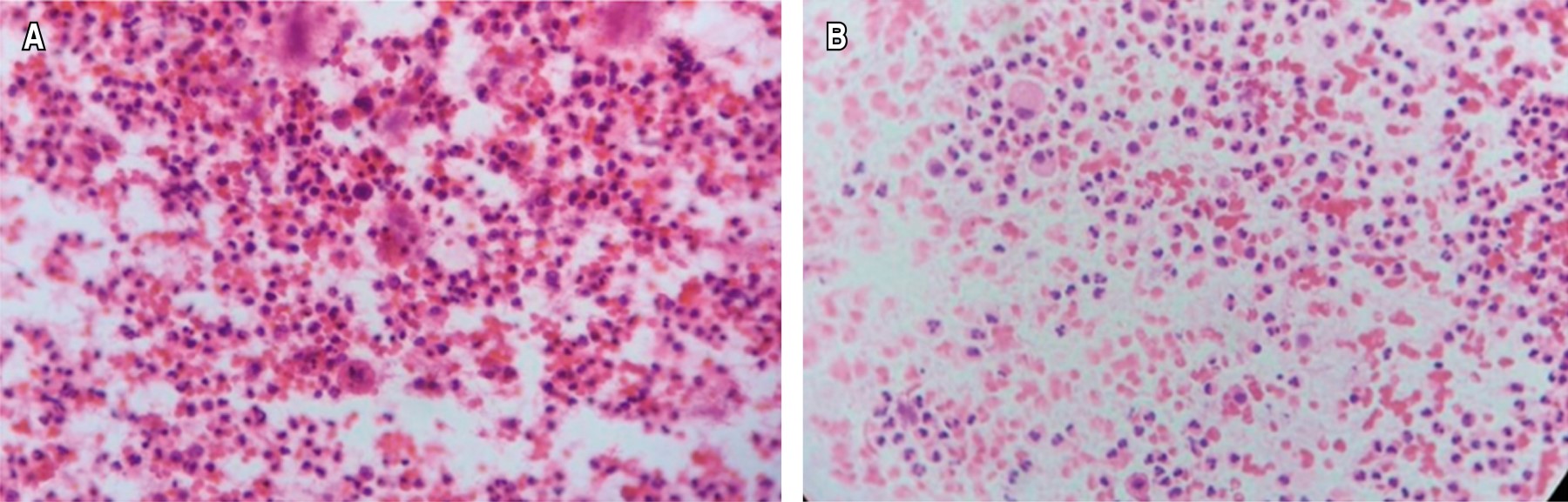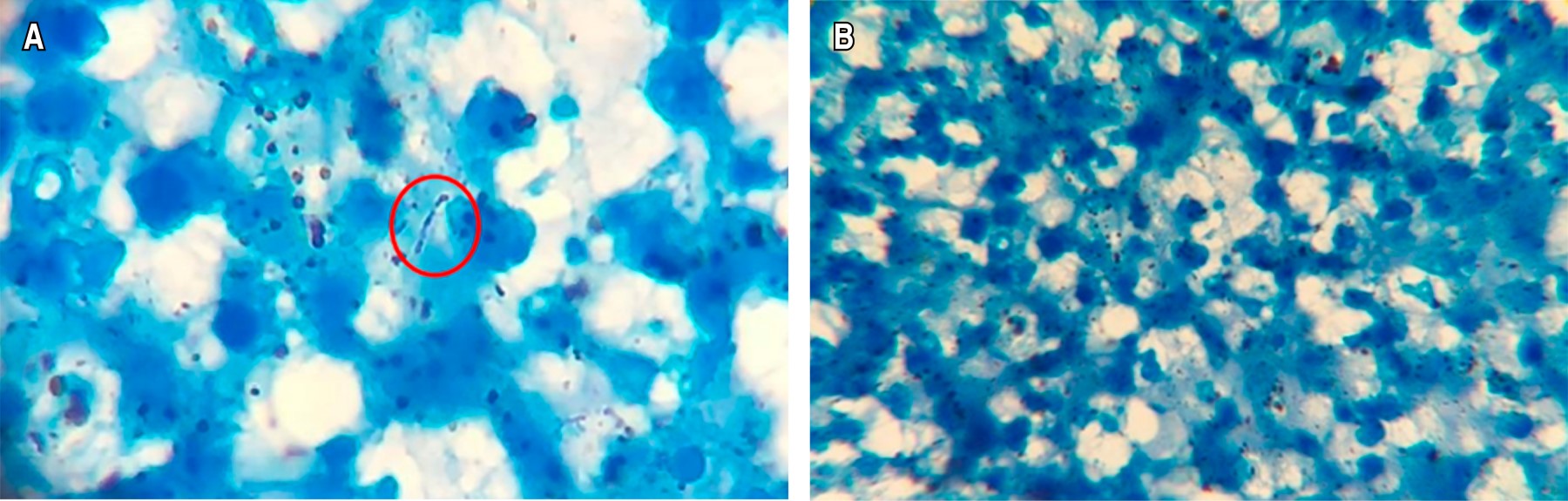 Con los diagnósticos establecidos, se realizó un drenaje de la región inguinal derecha ampliada (incisión tipo Gibson), del que se obtiene material purulento café-amarillento de primera instancia y material caseoso bien formado posteriormente (durante el mismo drenaje), se drena la totalidad de la colección que además se extendía hacia la región retroperitoneal en la zona 3. Se irriga la herida con solución salina, se cierra la herida con poliglecaprone 25 calibre 1-0 y se deja un drenaje tipo Jackson-Pratt. Se envía este material a citología (hematoxilina y eosina [HyE]) que reporta abundantes detritus y escasas colonias bacterianas inespecíficas (Figura 2), por lo que se realiza tinción de Ziehl-Neelsen (ZN) que muestra la presencia de bacilos ácido-alcohol resistentes (Figura 3), mientras que el cultivo definitivo confirmó el aislamiento de Mycobacterium tuberculosis.