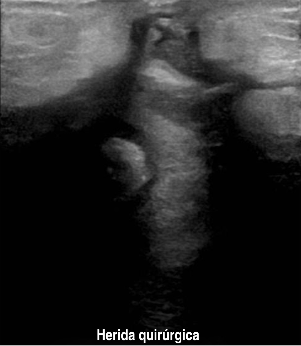 En estudios de laboratorio se reporta hemoglobina de 9.1 g/dl, hematocrito de 32.6%, trombocitosis de 492,000, leucocitosis de 18,340 con neutrofilia de 92%, tiempo de protrombina de 30 s e INR de 2.53. Se determina necesidad de intervención quirúrgica urgente; sin embargo, al no lograr Índice Internacional Normalizado (INR) meta y ante el potencial deterioro clínico cardiovascular de la paciente, se decide intervención inmediata con apoyo del servicio de anestesiología la aplicación de TAPB ultrasonoguiado por abordaje lateral de forma bilateral infiltrando 75 mg de ropivacaína + 50 mg de bupivacaina aforados a 20 cm3 con solución salina al 0.9% en cada hemiabdomen, además de administrar sedación con midazolam y fentanilo, posterior a lo cual, se retira el material de sutura de cirugía previa con hallazgo de 200 cm3 aproximadamente de material hematopurulento proveniente de tejido subcutáneo con extensión hacia lado izquierdo del mesogastrio, dehiscencia aponeurótica en porción cefálica de la herida con retracción leve de los bordes. Se realiza disección por planos hasta cavidad y se evidencia absceso de hueco pélvico bien delimitado de 50 cm3 aproximadamente; se efectúa aseo de cavidad con 1,000 cm3 de soluciones estériles y finalmente cierre de pared aponeurótica, así como piel. Por último, se coloca sistema de succión asistido por vacío.