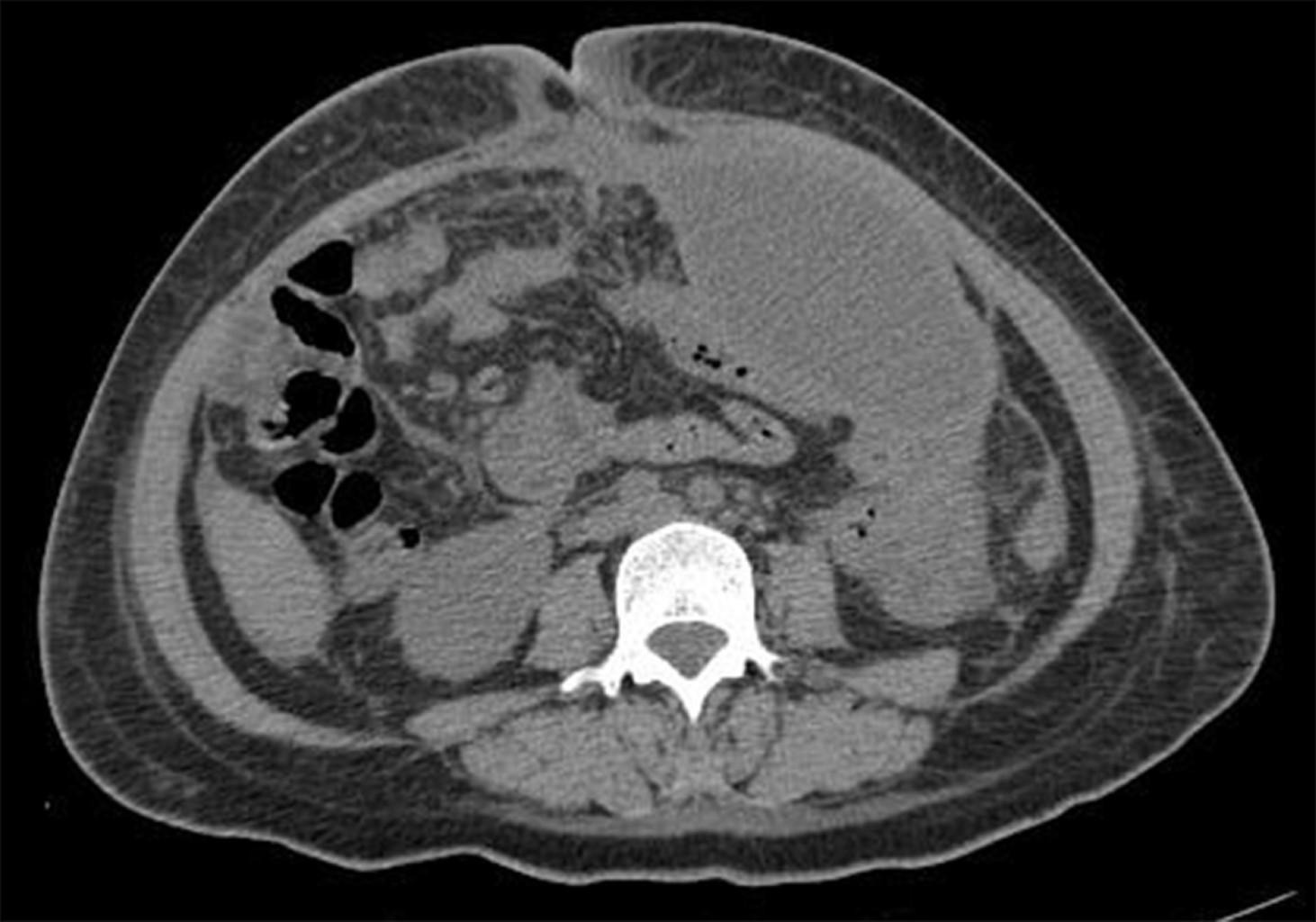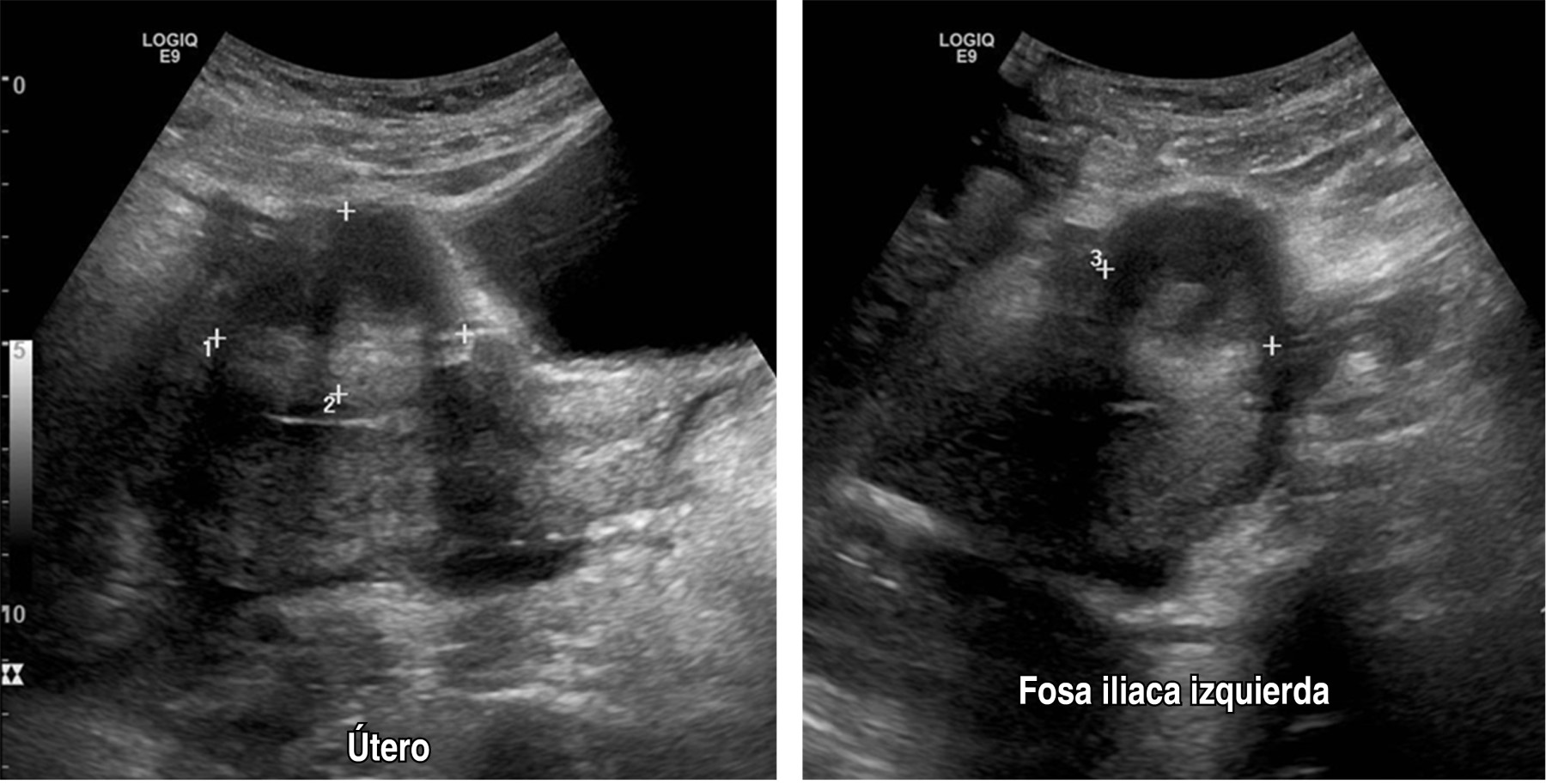 Paciente femenino de 40 años de edad, gesta cuatro, partos tres, con antecedente de estenosis valvular aórtica desde 2017 con manejo quirúrgico a base de colocación de prótesis valvular y acenocumarina hasta el diagnóstico de su último embarazo, durante el cual se suspende anticoagulante oral e inicia enoxaparina. Inicia padecimiento actual al ingresar al servicio de obstetricia con reporte de edad gestacional de 28.5 semanas de gestación (SDG) por última menstruación y de 29.4 por fetometría. Se diagnostica preeclampsia con datos de severidad, por lo que se decide realizar cesárea tipo Kerr y oclusión tubaria bilateral con técnica de Kroener, reportando 350 cm3 de sangrado, obteniendo producto único vivo, masculino, 31.5 semanas por Capurro, Apgar 7/8, con labio y paladar hendido. Egresa al quinto día requiriendo transfusión de hemoderivados en su postquirúrgico inmediato. Veintiún días después reingresa por sangrado abundante y fétido a través del abordaje quirúrgico, se hace curación y se evidencia defecto de pared abdominal, por lo cual se decide realizar ultrasonido, con hallazgos de defecto de pared anterior del abdomen en porción cefálica de la herida a través del cual protruyen asas intestinales (Figuras 1 y 2), en tomografía de abdomen se identifica colección heterogénea no medible en tercio medio y caudal de herida a nivel del plano subcutáneo, así como colección de pared gruesa en cavidad pélvica y fosa iliaca izquierda (Figura 3).