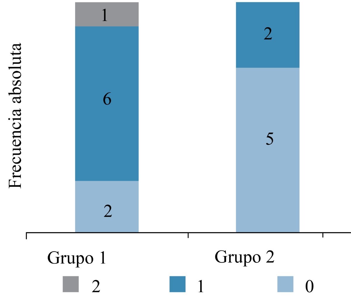 Con respecto a la característica del tejido óseo, en el grupo 1 hubo tres conejos con tejido necrótico (Figura 14) y en el grupo 2 hubo dos casos con tejido necrótico. La diferencia no fue estadísticamente significativa.