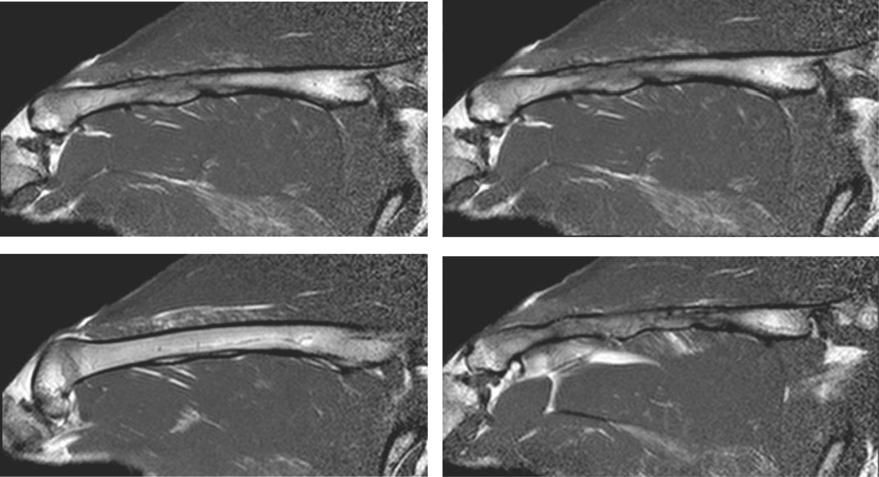 Al evaluar la revascularización ósea a través de las distintas técnicas de imágenes se observó que en el grupo 2 (aloinjerto intramedular), todos los casos mostraron una revascularización completa (Figura 10), ya sea con la radiografía (RX), la resonancia magnética (RMN) o la tomografía computarizada (TC). Pudimos objetivar dichos hallazgos debido a la importante integración que se generó con este tipo de tratamiento, ya que radiológica y tomográficamente no encontramos diferencias en el hueso tratado con el contralateral. En cuanto a la resonancia magnética, vemos que todo el fémur presenta la misma señal tanto en secuencias T1 como densidad protónica con supresión grasa. Creemos que esto está dado por la integración y revascularización que se produce con este tipo de injerto. En el grupo 1 (aloinjerto extramedular) se detectaron conejos con una revascularización parcial entre cuatro y seis de los 10 conejos, según la técnica de imagen. La diferencia entre grupos fue estadísticamente significativa en el caso de la RX y TC, con un valor de p < 0.05. Cabe señalar que con la TC en las parciales se detectó un porcentaje promedio de revascularización de 82.5%.