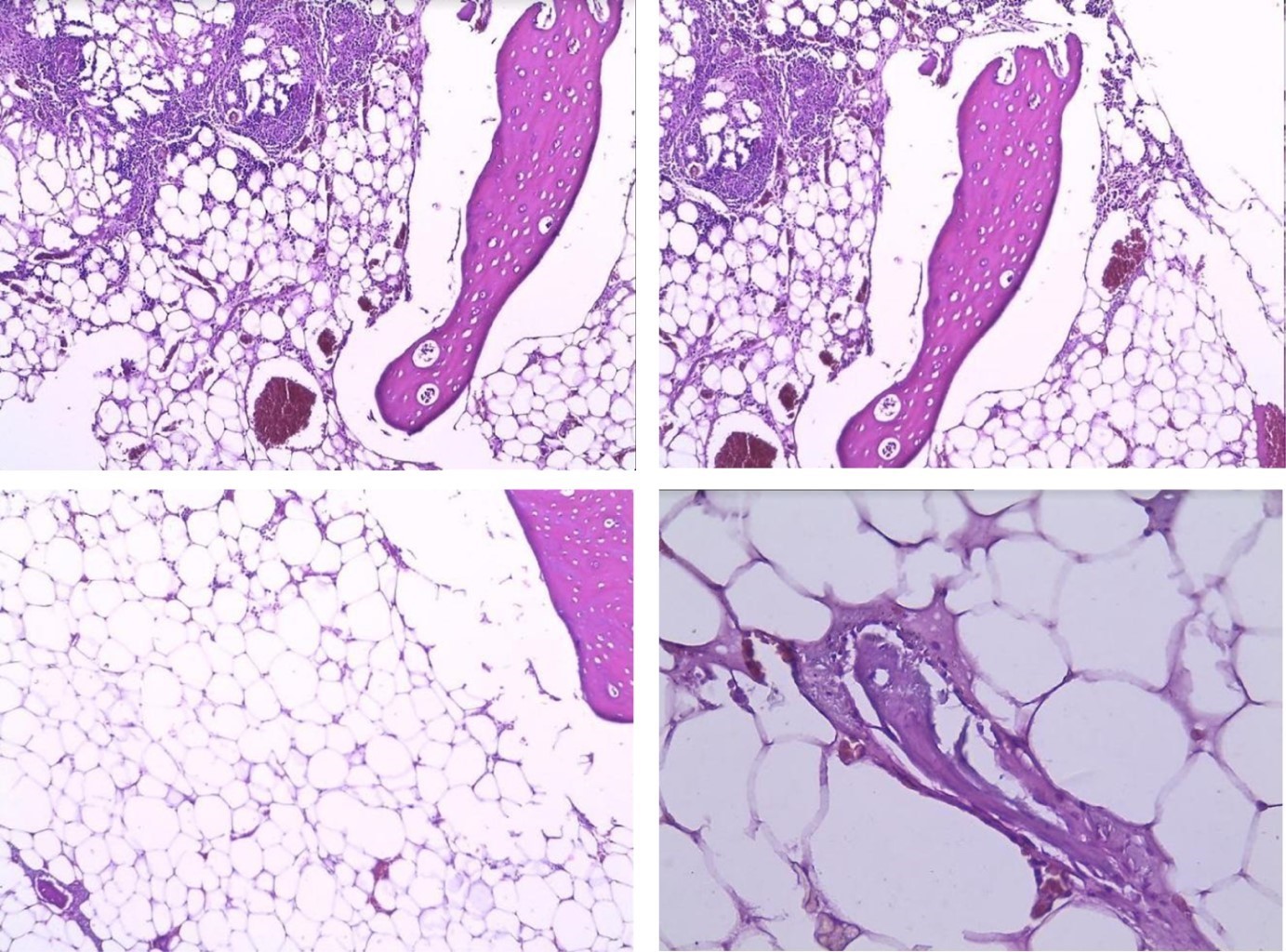 Se realizó una evaluación cualitativa y cuantitativa de las muestras para determinar la proliferación celular y vascular, el grado de fibrosis e inflamación. Por otro lado, se realizó estudio de inmunohistoquímica con marcador vascular CD31 para determinar la revascularización de cada pieza ósea. Todas las muestras fueron evaluadas por el mismo patólogo ciego al tipo de tratamiento (Figura 9).