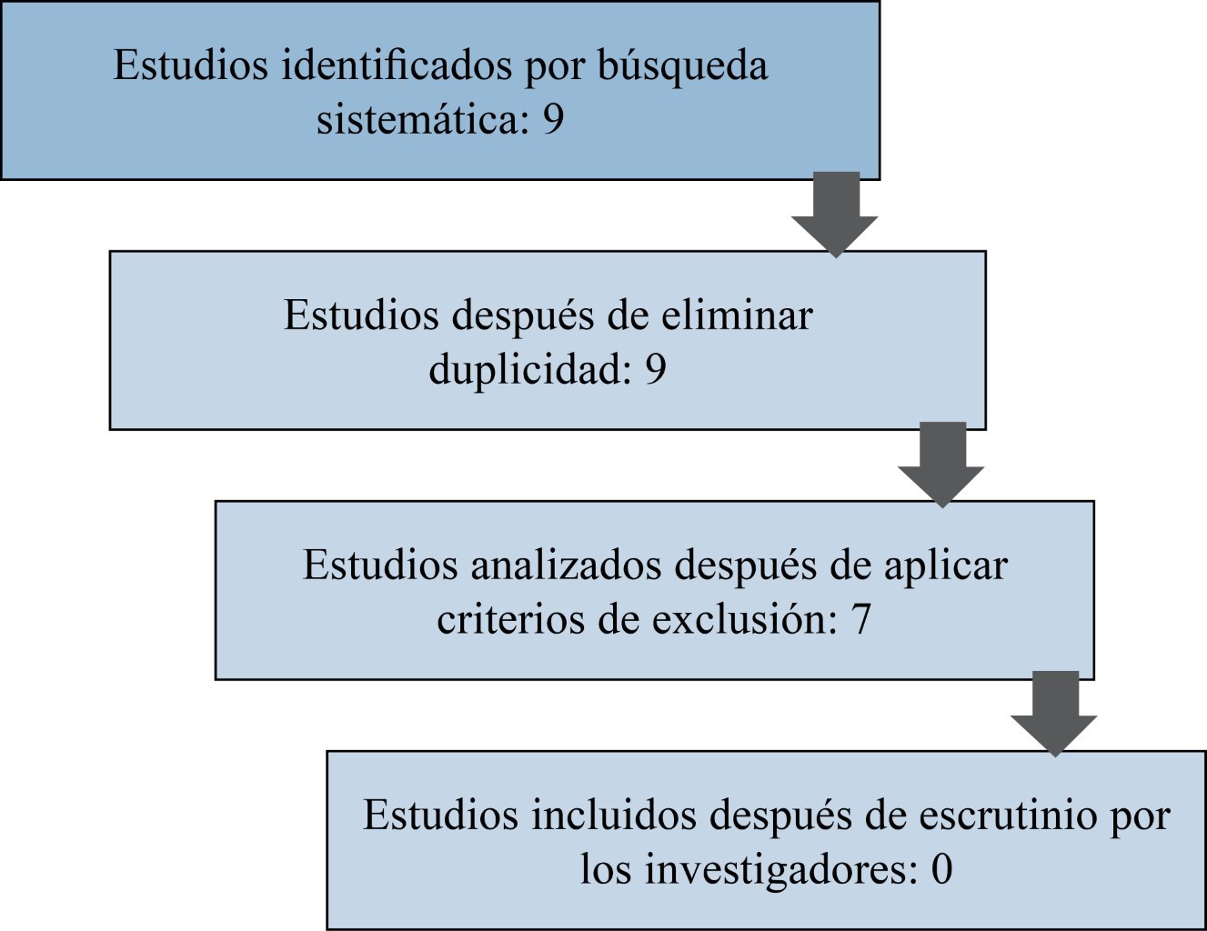 La búsqueda electrónica incluyó las bases de datos de PubMed, Embase, Cochrane Central Register of Controlled Trials (CENTRAL), Trip Database y National Institute for Health and Care Excellence (NICE). No hubo limitaciones de fecha o lenguaje. Todos los artículos fueron manualmente evaluados por los autores. Por último, ningún artículo ha reportado la asociación buscada.
