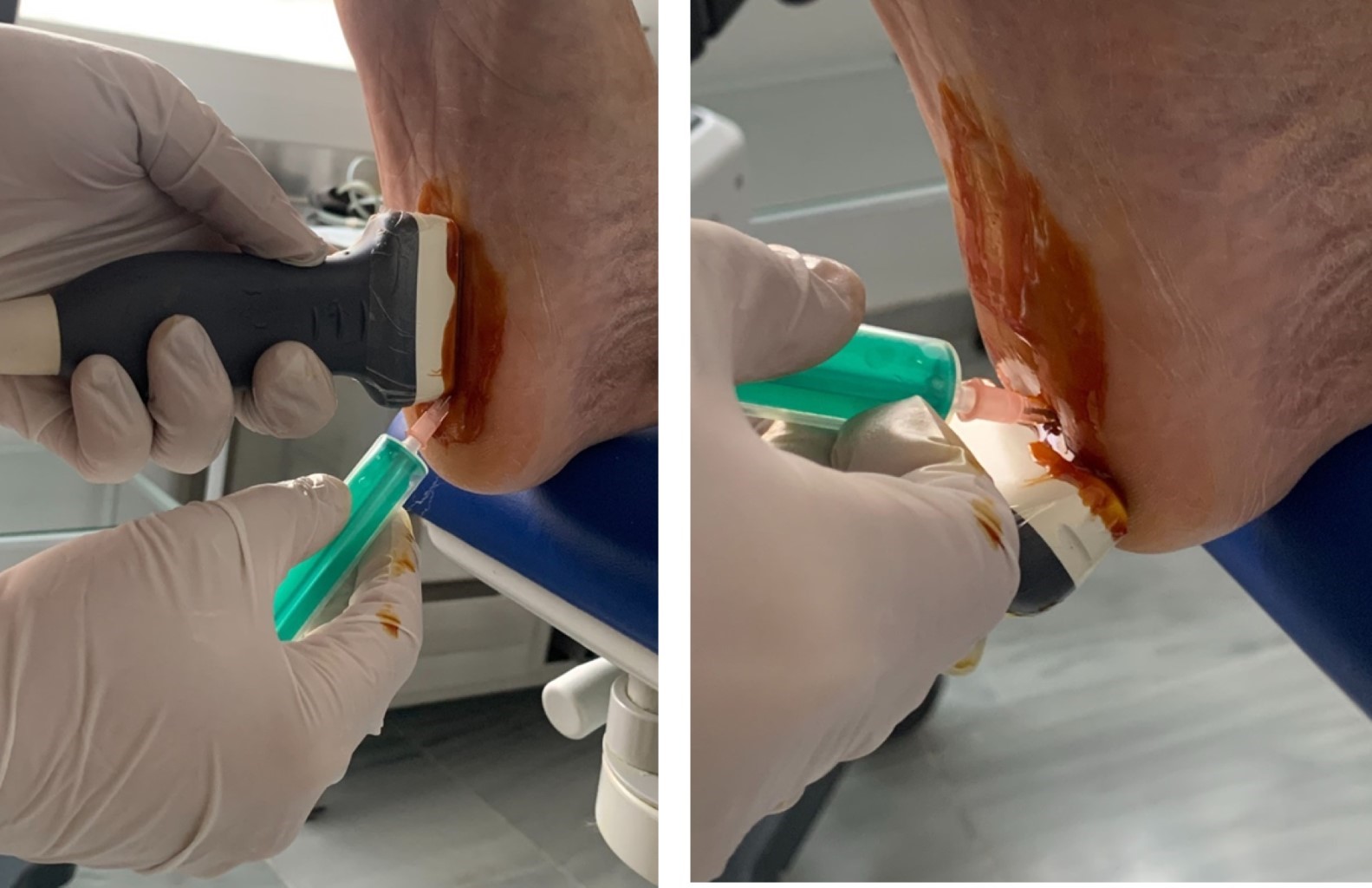 - 1. Se realiza un bloqueo anestésico ecoguiado del nervio tibial posterior, con 3-4 cm3 de mepivacaína al 2%.