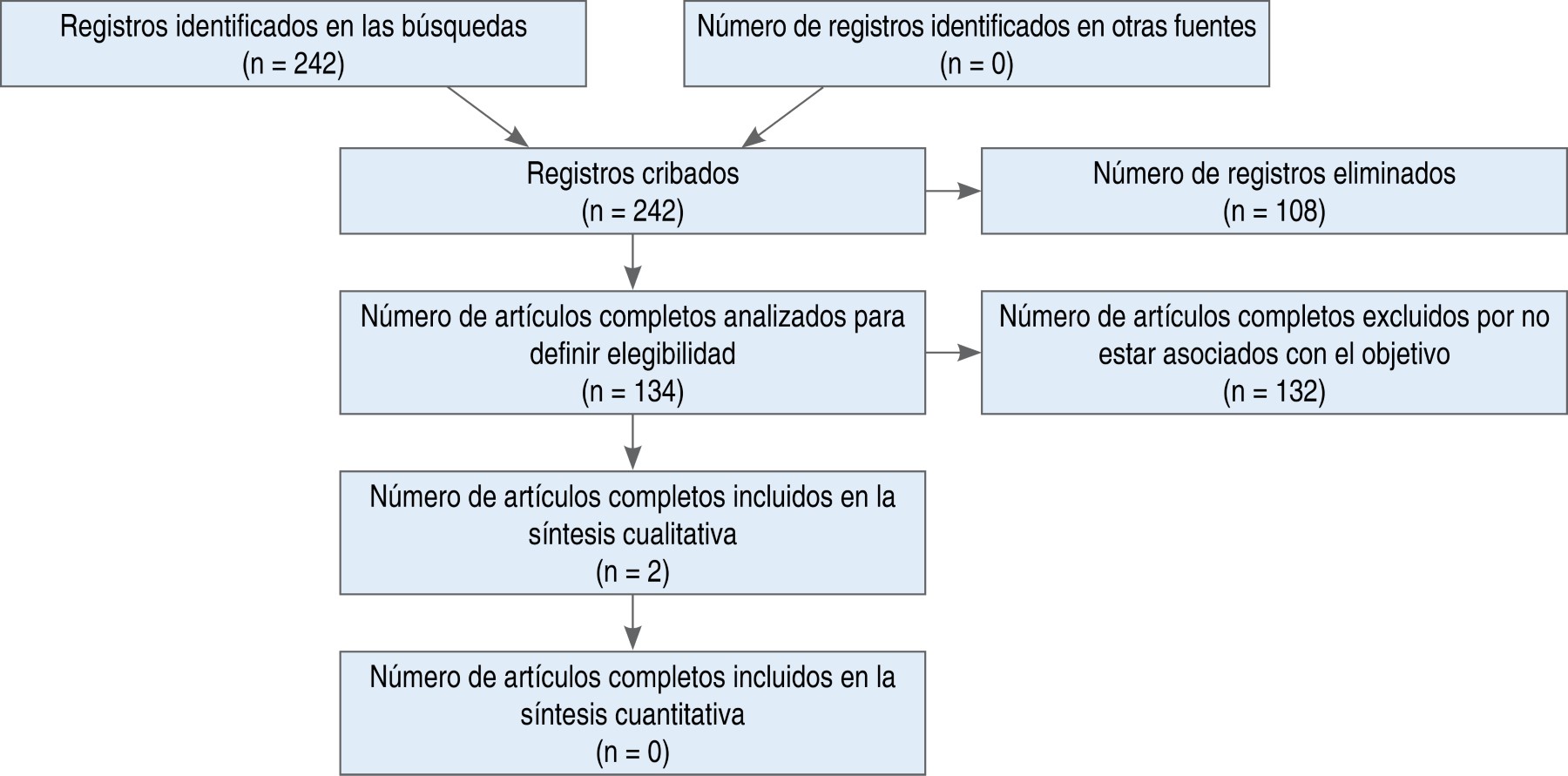 Con los términos de búsqueda se encontraron 242 publicaciones. De éstas, se excluyeron 108 en el cribado por título y resumen, 28 de ellas por tratarse de artículos de revisión. Aunque no hubo restricción inicial por idioma, se excluyeron dos artículos en alemán, cinco presentaciones de casos, una carta y un comentario. Las demás se excluyeron por no corresponder al objetivo de la investigación. De la revisión fueron seleccionados dos artículos para análisis cualitativo.