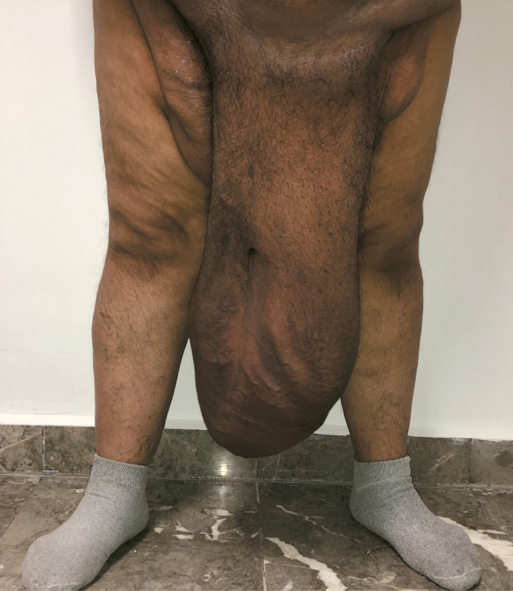 Paciente masculino de 32 años de edad, mexicano, de origen étnico mestizo, ocupación taxista, con antecedentes personales de sedentarismo, obesidad mórbida (índice de masa corporal [IMC] = 57), quien acude a consulta por presentar una hernia inguinoescrotal izquierda de 10 años de evolución. Al examen físico se confirma que el paciente presenta una hernia inguinoescrotal que excede el borde superior de la patela izquierda y cambios tróficos de la piel escrotal (Figura 1). El ultrasonido inguinal mostró un saco herniario de contenido intestinal y omental. Durante su estancia hospitalaria se inicia con NPP mediante la introducción de una aguja de Veress en el punto de Palmer. Se insuflaron 200 cm3 de aire ambiente con jeringa de 100 cm3. Posteriormente, se colocó catéter de doble luz (subclavio) con la técnica de Seldinger. Se insuflaron 800 cm3 de aire ambiente y se corroboró la presencia de neumoperitoneo mediante una radiografía de tórax en bipedestación. Se administraron 1,000 cm3 cada 24 horas durante 21 días hasta un volumen total de 21,000 cm3.