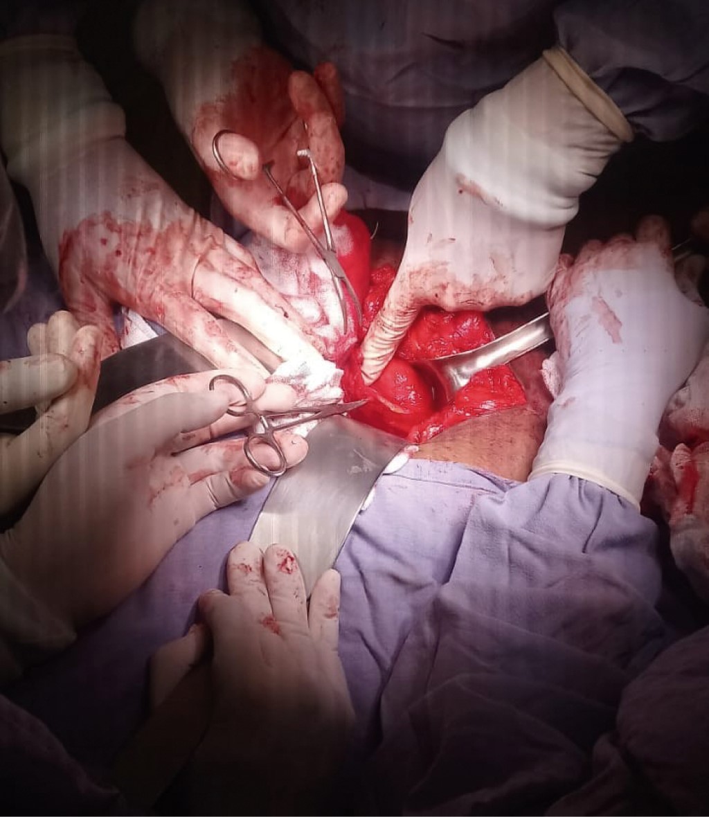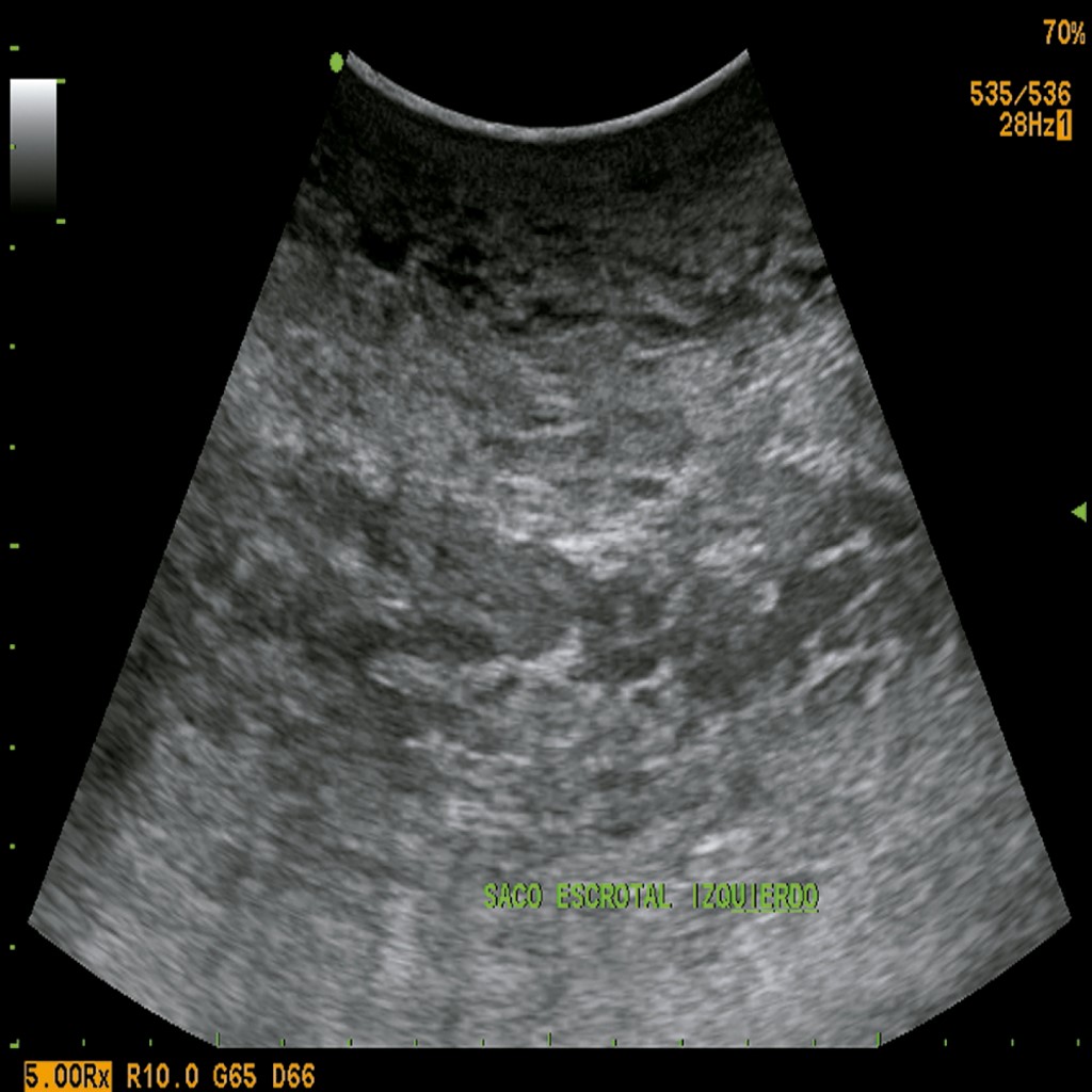 Bajo anestesia regional, se realiza un abordaje inguinal izquierdo mediante una incisión transversal estándar. Se identificó un saco herniario directo, el cual se disecó y se separó del cordón espermático. Tras la apertura del saco herniario se identificaron asas de intestino delgado, colon sigmoides y epiplón (Figuras 2, 3 y 4), los cuales se introdujeron manualmente a la cavidad abdominal sin dificultad. Se reparó el defecto anatómico de acuerdo a la técnica de Lichtenstein; durante el transoperatorio y postoperatorio no hubo cambios pulmonares restrictivos. El paciente se dio de alta al cuarto día de estancia intrahospitalaria por mejoría. Después de un seguimiento clínico y ecográfico por 1.5 años, no se registró recurrencia de la hernia (Figura 5). Actualmente el paciente refiere que su calidad de vida mejoró notablemente aumentando sus relaciones personales y sexuales.