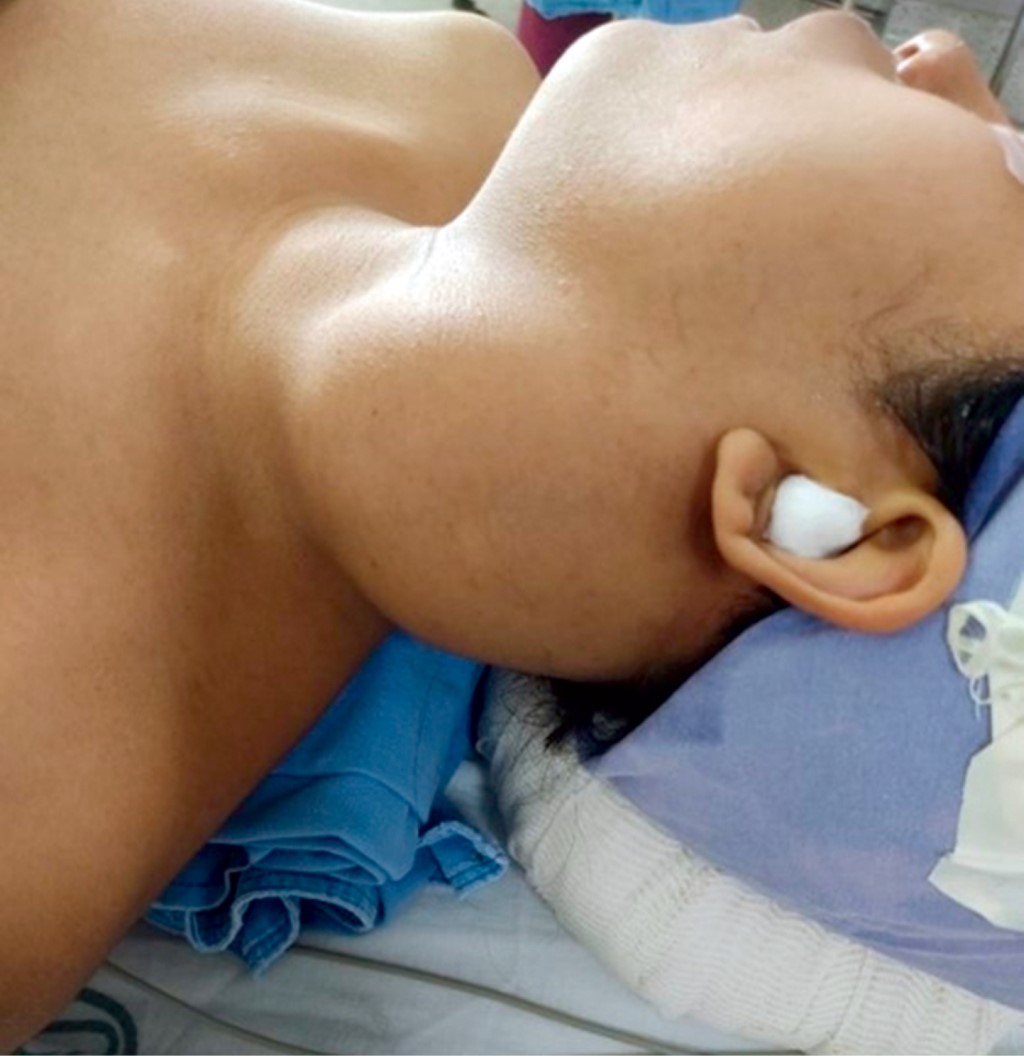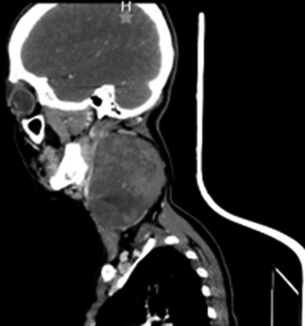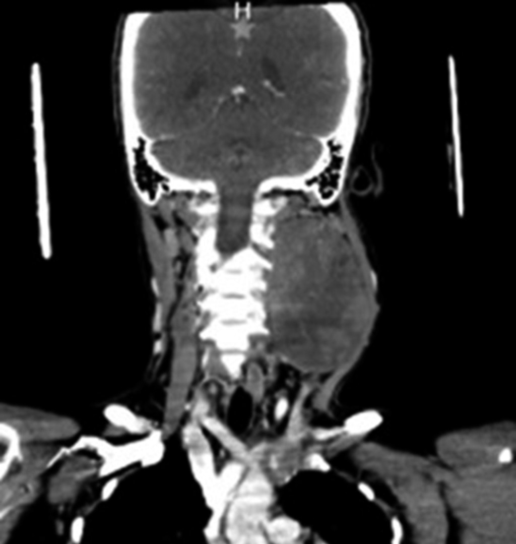 A la exploración física dirigida hay presencia de tumor cervical de 12 × 8 × 10 cm aproximadamente, indurada fija a planos profundos, que abarca región II, III y Va de hemicuello izquierdo (Figura 1), ligeramente dolorosa a la palpación 3/10 EVA, sin dificultad a la apertura bucal, sin datos de asimetría facial y sin compromiso de vía respiratoria.