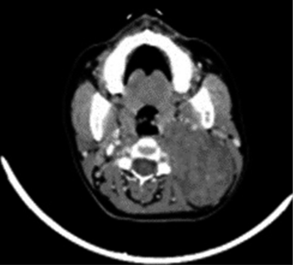 Sin datos de síndrome de respuesta inflamatoria sistémica, inestabilidad hemodinámica o compromiso cardiopulmonar, como complemento diagnóstico se solicita tomografía computarizada, la cual reporta gran masa redondeada de aspecto sólido de bordes regulares, bien delimitados, heterogénea de predominio hipodensa, con pequeñas zonas de menor densidad en su interior, sin identificar calcificaciones, con una densidad entre 24 y 37 UH y que posterior a la administración de medio de contraste intravenoso presenta una densidad entre 33 y 87 UH, localizado en nivel parafaríngeo izquierdo de 6.6 × 7.5 × 9.2 cm, lesión de espacio parafaríngeo izquierdo con sospecha de quiste branquial versus adenoma pleomorfo versus quiste branquial hemorrágico (Figuras 2, 3 y 4).