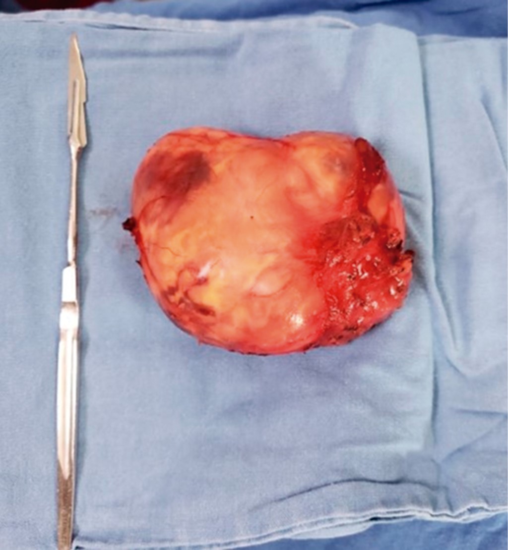 Se hace protocolo de estudio y se programa para tiempo quirúrgico; en mesa de operaciones con paciente en decúbito supino con posición de Rossier se realiza cervicotomía mediante incisión cervical de Paul André, disecando por planos (piel, tejido celular subcutáneo, platisma) ubicando músculo esternocleidomastoideo, el cual se refiere encontrando detrás del mismo una tumoración localizada en espacio parafaríngeo situada entre vena yugular interna y arteria carótida (Figura 5), la cual se diseca siendo enucleada, se realiza una meticulosa disección subcapsular buscando así preservar las funciones del nervio de origen aparente, el X par craneal, evitando la resección de éste. Dicha pieza es enviada a patología, se realiza hemostasia, se coloca drenaje cerrado de presión negativa tipo Drenovac de 1/8 y se cierra por planos cerrando fascia con Vicryl 2-0 y afrontando piel con nylon 3-0 punto intradérmico, dando por terminado evento quirúrgico.