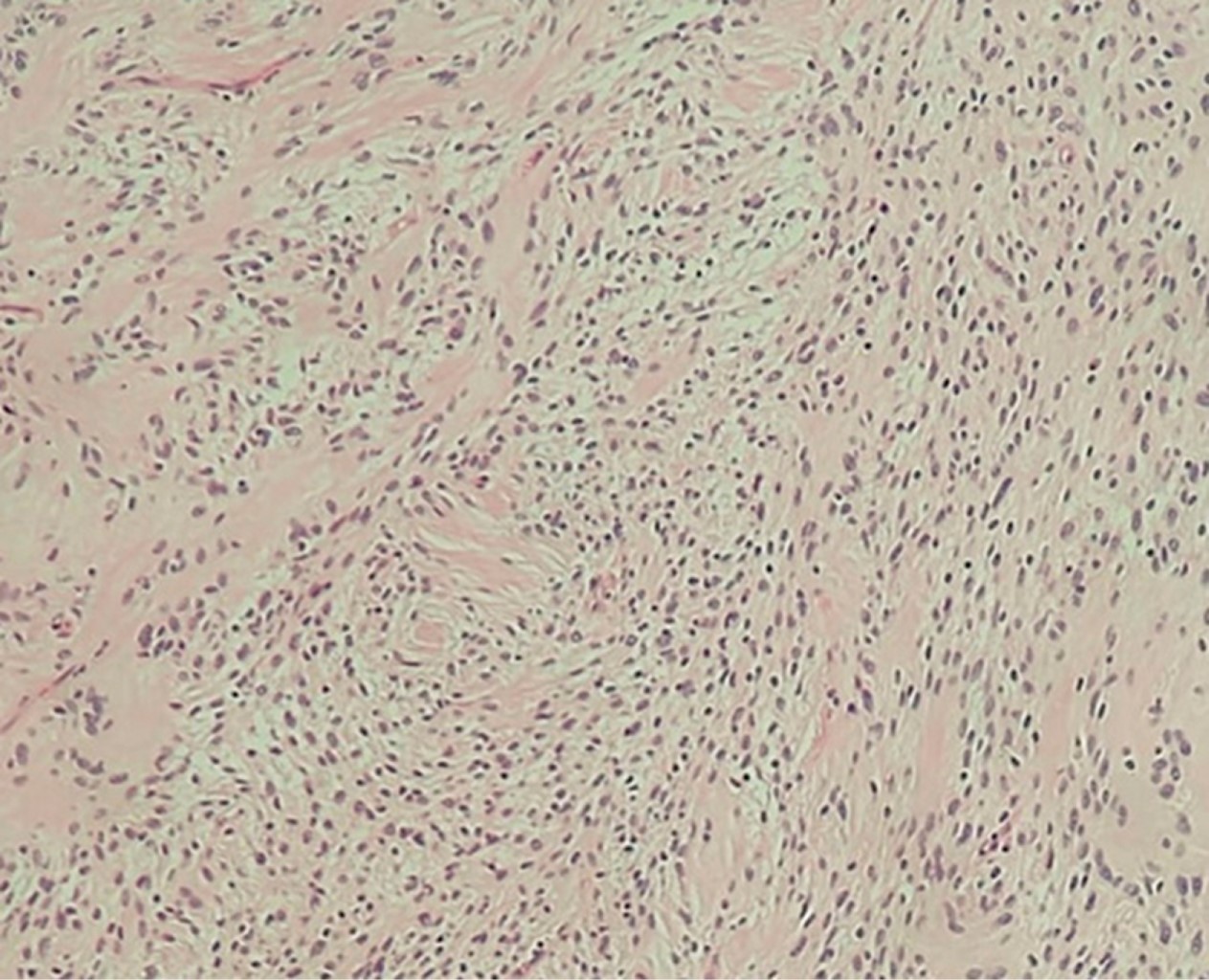 Las áreas de Antoni B con tendencia a presentar hipocelularidad con formación irregular predominan en un estroma mixoide laxo con vasos sanguíneos y células inflamatorias crónicas.