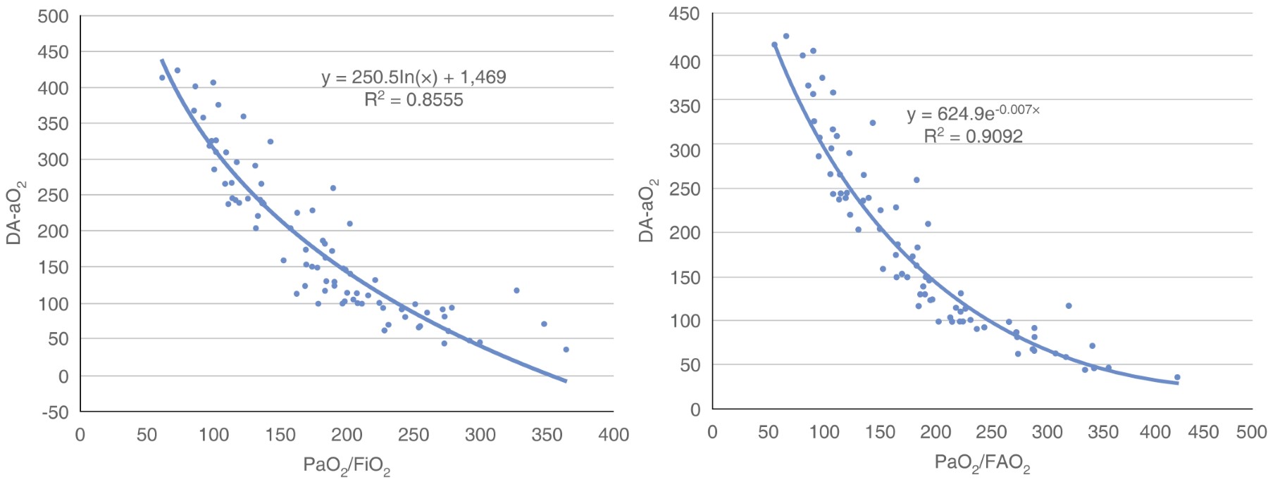 En un análisis post hoc se estimó la correlación entre la diferencia alveolo arterial de oxígeno (DA-aO2) y la PaO2/FAO2 y encontramos que existe una excelente correlación no lineal entre ambos índices (R2 = 0.90), a diferencia de la correlación observada entre la DA-aO2 y el índice de PaO2/FiO2 (R2 = 0.84) (Figura 2).