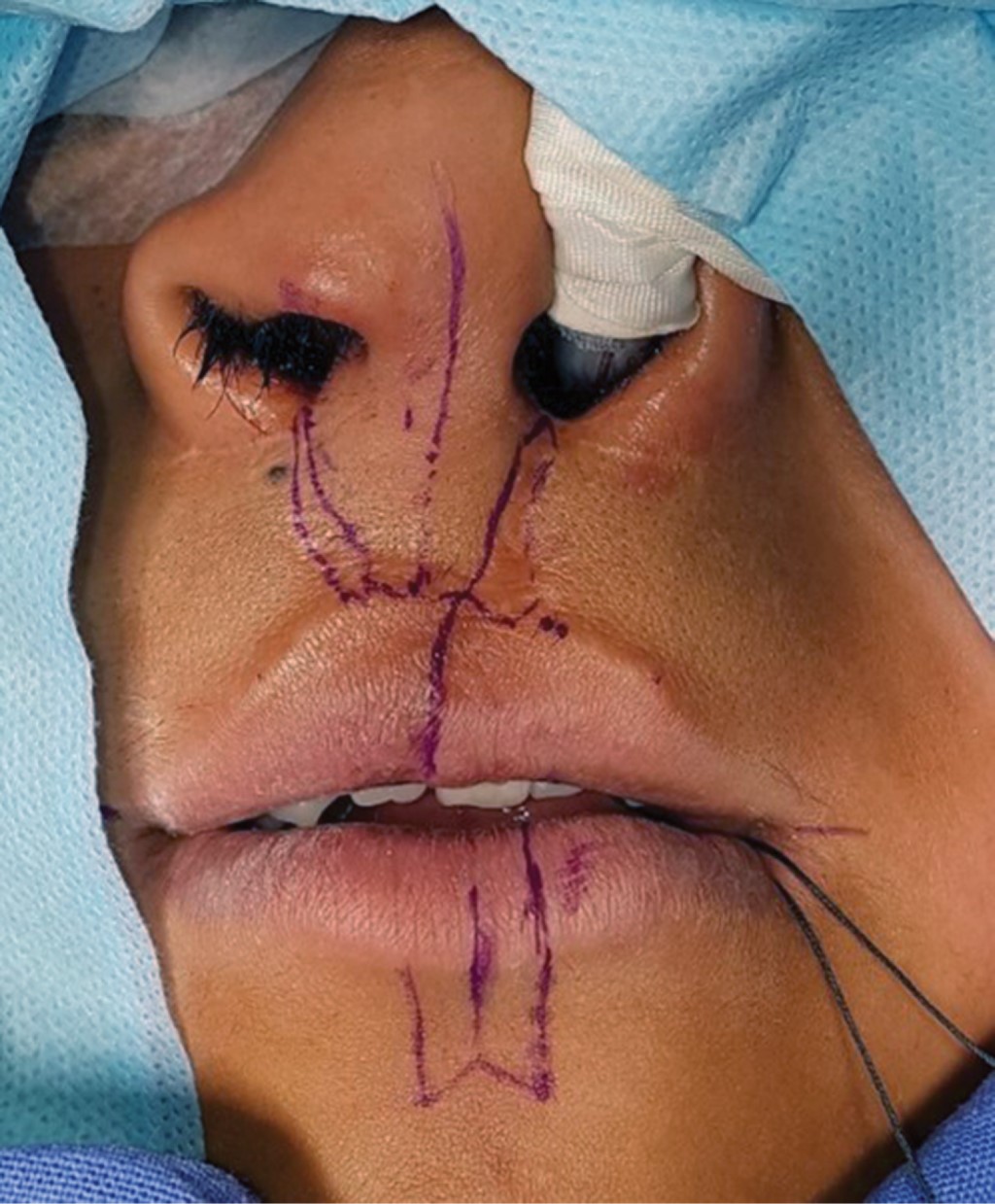 Los pacientes se encontraban bajo anestesia general con intubación endotraqueal. Antes de la infiltración de anestesia local con vasoconstrictor, se realizó el marcaje de manera precisa y consistente en los labios, de tal manera que se identifiquen los puntos de referencia anatómicos existentes y áreas que requieren resección; se marcaron los bordes cicatrizales del filtrum labial, posteriormente se marcaron las comisuras para determinar distancia de las futuras columnelas (Figura 4). Se realizó el marcaje en el labio inferior, estableciendo el tamaño del colgajo y la posición adecuada para la rotación.