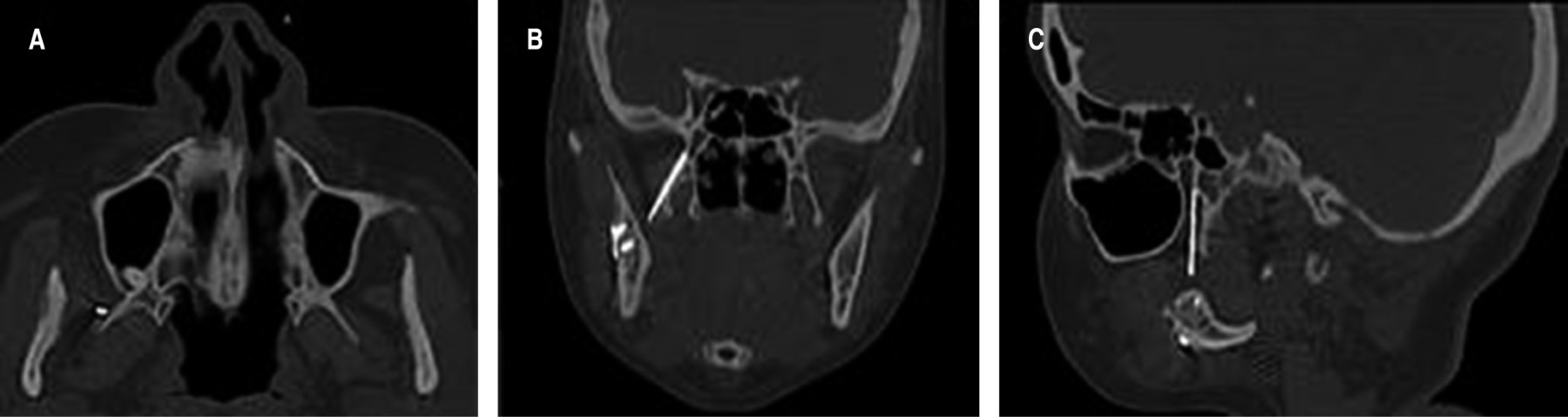 La fosa pterigomaxilar (FP) contiene estructuras vasculares y nerviosas de importancia que pueden entorpecer el acceso quirúrgico, este mismo se realiza comúnmente mediante abordajes abiertos transfaciales o mediante endoscopia transnasal para el tratamiento de neoplasias que afectan la FP.11 Existen diferentes formas de abordar la FP para remoción de CE: Vargas en 2010 reportó un caso clínico de un CE de madera alojado en ambas FP, para lo cual emplearon un abordaje con osteotomía Le Fort I para la remoción del mismo;1 Liceaga en 2013 reportó el uso de la fluoroscopia para el retiro de un tercer molar de la FP;4 otra alternativa para el retiro de CE en el macizo facial es el empleo de sistemas de navegación quirúrgica, sin embargo, son equipamientos de alto costo y requieren de curva de aprendizaje.10