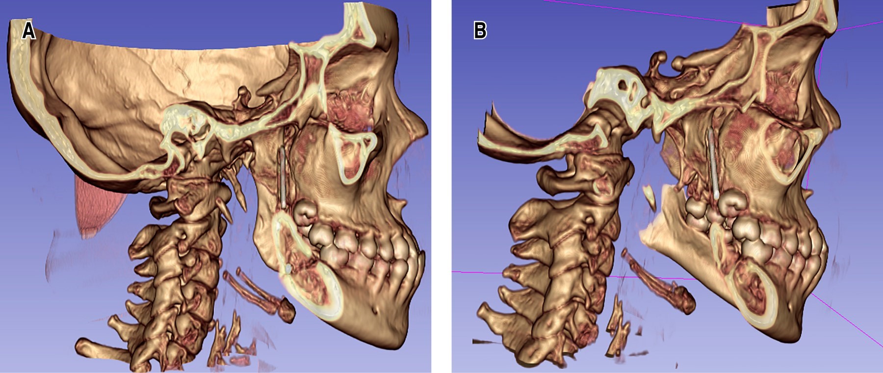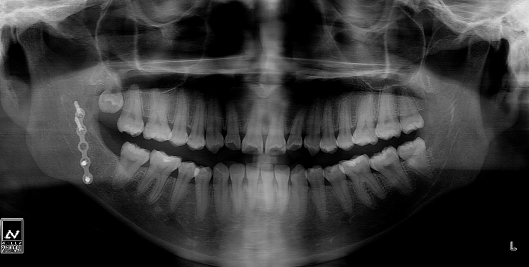 Se trata de paciente femenino de 25 años de edad, sin enfermedades sistémicas, quien refiere que 30 días antes del ingreso sufrió una agresión por terceras personas recibiendo golpes con puño en hemicara derecha, razón por la cual acudió a otra institución de salud donde le diagnosticaron una fractura de ángulo mandibular derecho y le realizaron reducción abierta más fijación interna con material de osteosíntesis. Posteriormente, siete días antes del ingreso, la paciente refiere que persistía la limitación de la apertura bucal y el dolor localizado de moderada intensidad al momento de la apertura, motivo por el cual se realizó una tomografía espiral multicorte (TEM) y acude a nuestro Servicio de Cirugía Bucal y Maxilofacial en el Hospital Nacional Cayetano Heredia, requiriendo tratamiento especializado.