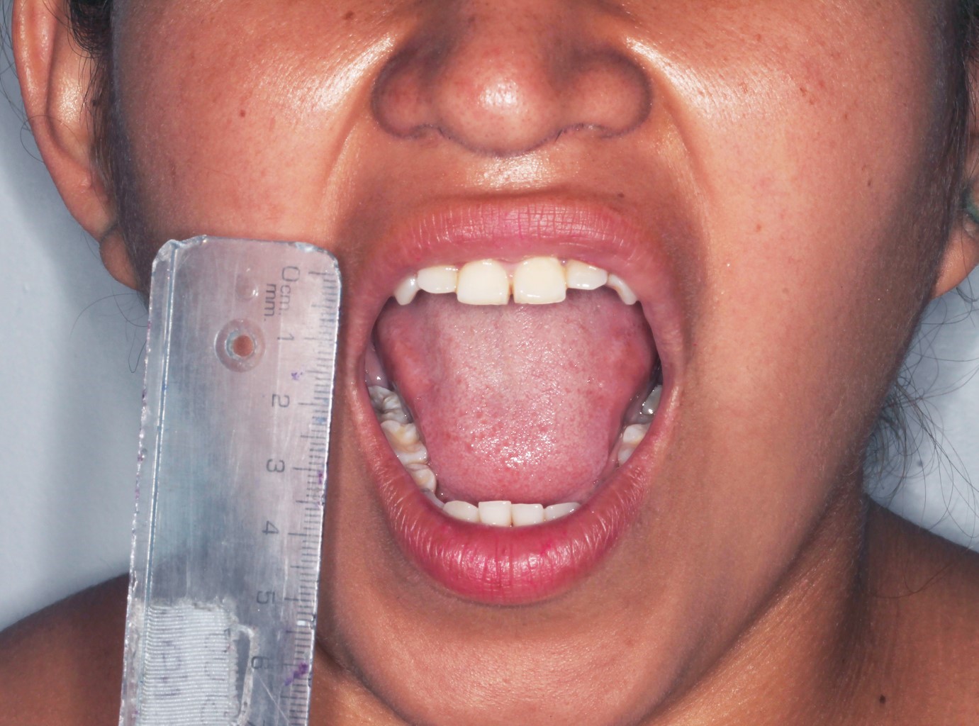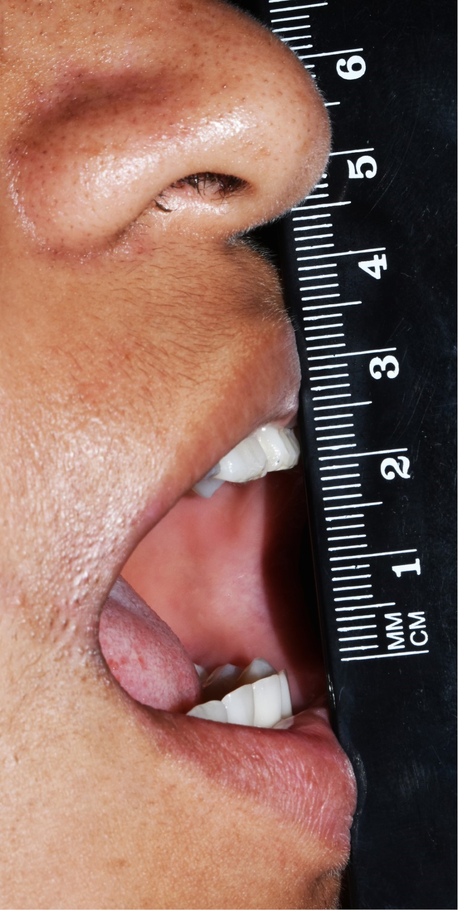 A la evaluación extraoral se evidenciaba un perfil cóncavo; las demás estructuras se encontraban conservadas. A la evaluación intraoral se evidenciaba limitación de la apertura bucal de 2 cm (Figura 3), mucosas orales hidratadas, oclusión estable, maloclusión clase III y la presencia de sintomatología dolorosa a la apertura bucal en una escala EVA 7/10, además de presentar una cicatriz quirúrgica en rama mandibular, sin signos de infección.