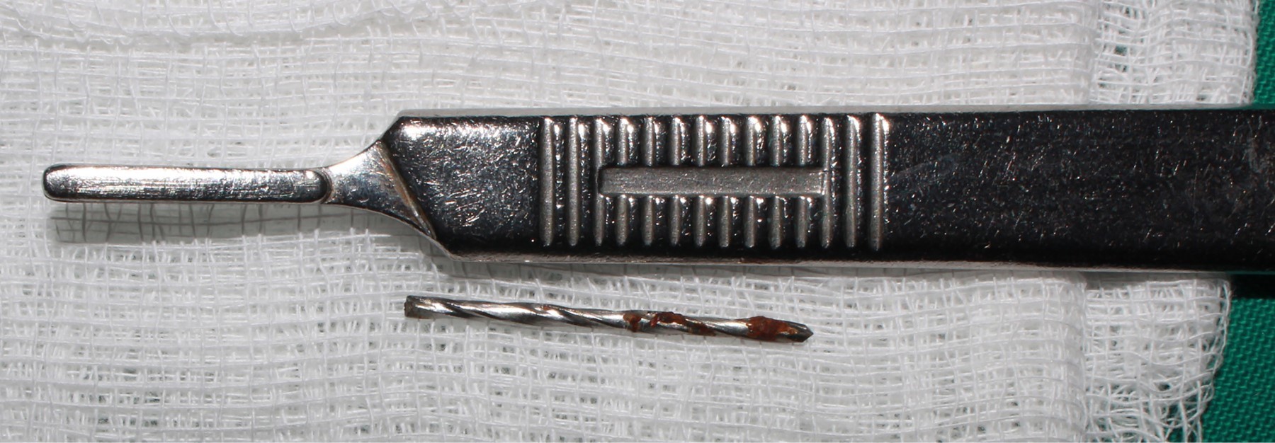 Con base en la literatura revisada no se encontró ningún caso similar de complicación postoperatoria de fracturas mandibulares con inclusión de CE en la FP. Es importante mencionar que estas brocas percutáneas utilizadas para la instalación de tornillos distales en fracturas u osteotomías a nivel del ángulo mandibular deben ser empleadas mediante su guía de canal para que ésta no sufra cambios de dirección, por lo que una falla en la técnica podría haber sido un factor causal, otras posibles causas de ruptura de la misma podrían ser defectos de fábrica o el uso prolongado, al momento no es posible determinar la verdadera causa de la ruptura de la broca.