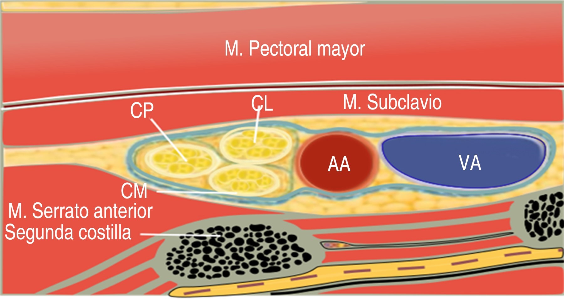 El bloqueo de plexo braquial se usa de forma amplia para analgesia o anestesia en cirugía de antebrazo y mano. Hoy en día se realiza con mayor frecuencia en la fosa infraclavicular, abordaje lateral sagital (BPBLS). El cual tiene una gran evidencia de seguridad debido a que evita la pared torácica y la pleura; sin embargo, los cordones del plexo braquial se encuentran a una profundidad de 3-6 cm, separados entre sí, con variaciones interindividuales significativas en relación con la arteria axilar. Por lo que son necesarias múltiples inyecciones o volúmenes mayores de anestésico local (AL) de 35-40 mL, aun con el uso de ultrasonido (USG)(1-4). En 2015 se propuso que el bloqueo de plexo braquial con abordaje costoclavicular (BPBCCV) ofrece ventajas como sitio de inyección único, por lo que es un sitio adecuado para la colocación de catéter de analgesia continua, debido a que en el espacio costoclavicular, en contraste con el espacio infraclavicular lateral sagital, los cordones del plexo braquial se agrupan de forma lateral a la arteria axilar formando una disposición triangular y compartiendo una relación constante entre sí(5,6) (Figura 1).