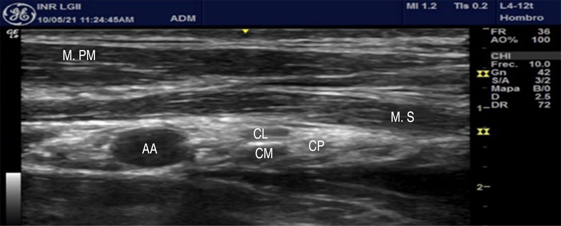 Sala-Blanch X y su equipo describieron la anatomía y topografía de los cordones a este nivel en eje sagital, donde se observa que los cordones del plexo braquial atraviesan el espacio que se encuentra entre el pectoral mayor y el músculo subclavio de forma anterior, junto con los vasos axilares (Figura 1). Además, puntualizan al cordón lateral como el más superficial de los tres cordones, siempre anterior a los cordones medial y posterior. Por otra parte, el cordón medial se encuentra posterior al cordón lateral pero medial al cordón posterior; finalmente, el cordón posterior es el más lateral de los tres cordones. Otro dato importante es que a este nivel los cordones están recubiertos por tejido conectivo, así, el cordón lateral es recubierto por su propio tejido conectivo, mientras que los cordones medial y posterior comparten y se rodean de un mismo tejido conectivo(10-13) (Figura 1). Consecuentemente se ha especulado que este beneficio anatómico, acompañado de la abducción del brazo, podría resultar en una mejor visualización del plexo braquial(8,11,14), por lo que demuestra ser un abordaje más seguro y con menores complicaciones como punción vascular y neumotórax(15).