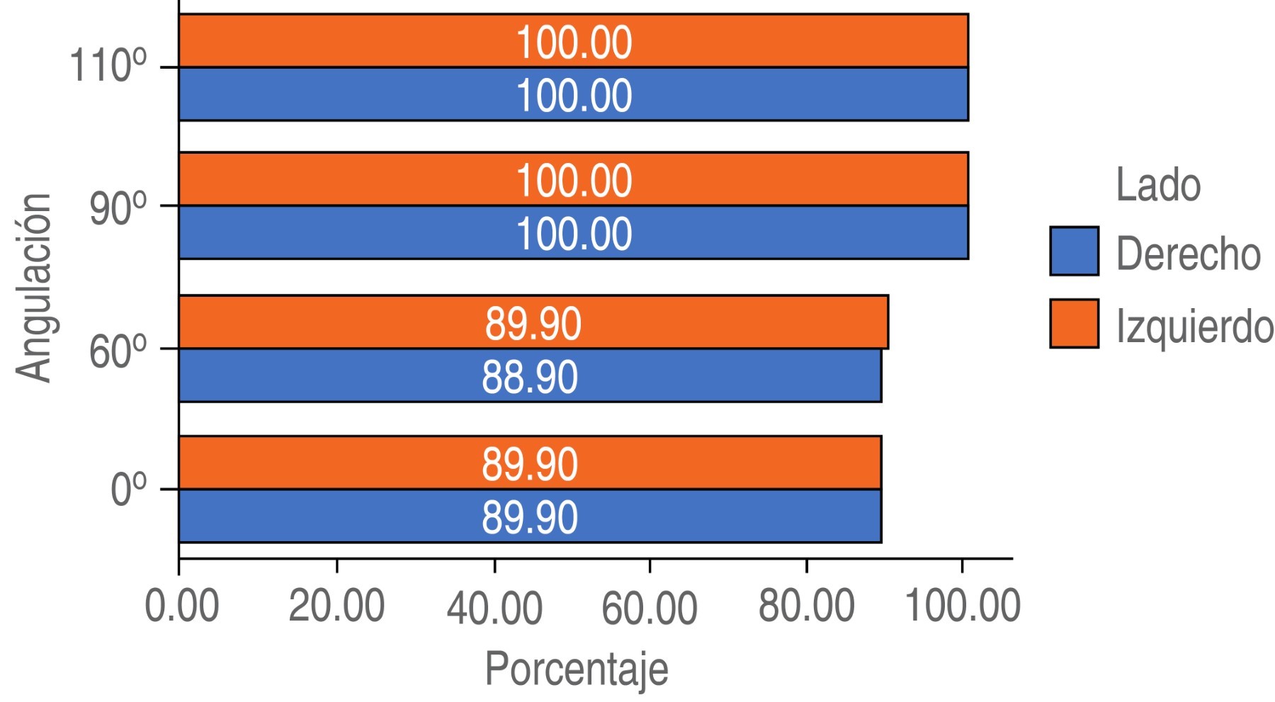 La muestra estuvo integrada por 55 hombres (55.6%) y 44 mujeres (44.4%) con una edad promedio de 35.8 ± 11.2 entre rangos de 18-82 años. Las características antropométricas observadas en hombres y mujeres no difieren significativamente en el IMC, al observarse (Tabla 1) 27.5 (DE 3.4) masculino versus 26.3 (DE 5.4) del femenino (p = 0.22). En cuanto a la angulación, de ambos lados (derecho e izquierdo), observamos que a 0o se visualizaron las estructuras del plexo braquial en 88.9% de los casos, a 60o del lado se visualizaron 89.9%, mientras que a 90o y 110o se observaron en 100% de los casos (Figura 5).