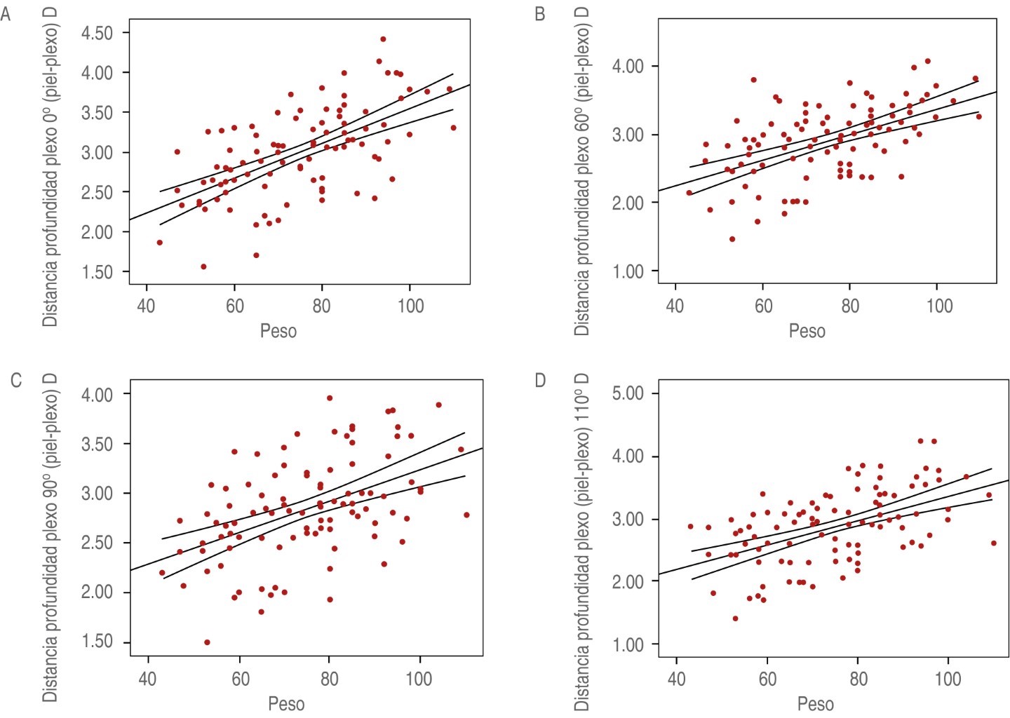 Considerando la muestra total de 99, las medias de las distancias piel-plexo y plexo pleura al comparar el lado derecho con el izquierdo, no muestran significancia estadística (p > 0.05); empero, como se puede observar en la Tabla 3. Realizando un modelo de regresión lineal múltiple por pasos sucesivos podemos predecir la profundidad del plexo braquial de acuerdo con las siguientes fórmulas, según angulación del brazo 0o, 60o, 90o, 110o y el peso del paciente (Figura 6). Para el género femenino, la fórmula de la distancia piel plexo será: 1) distancia piel-plexo a 0o = 1.015 + (0.028 × peso); 2) distancia piel-plexo a 60o: 1.356 + (0.022 × peso); 3) distancia piel-plexo a 90o: 1.576 + (0.017 × peso); 4) distancia piel-plexo a 110o: 1.313 + (0.21 × peso). Es decir que, si un paciente femenino pesa 60 kg, la predicción es que la distancia piel plexo a 90o de angulación será: 1.576 + 0.017 (60 kg) = 2.596 cm distancia piel plexo. Lo cual concuerda con los datos empíricos medidos. La fórmula de distancia piel plexo para el género masculino será: 1) distancia piel-plexo a 0o = 1.51 + (0.028 × peso); 2) distancia piel-plexo a 60o: 0.957 + (0.024 × peso); 3) distancia piel-plexo a 90o: 1.673 + (0.016 × peso); 4) distancia piel-plexo a 110o: 1.944 + (0.014 × peso).