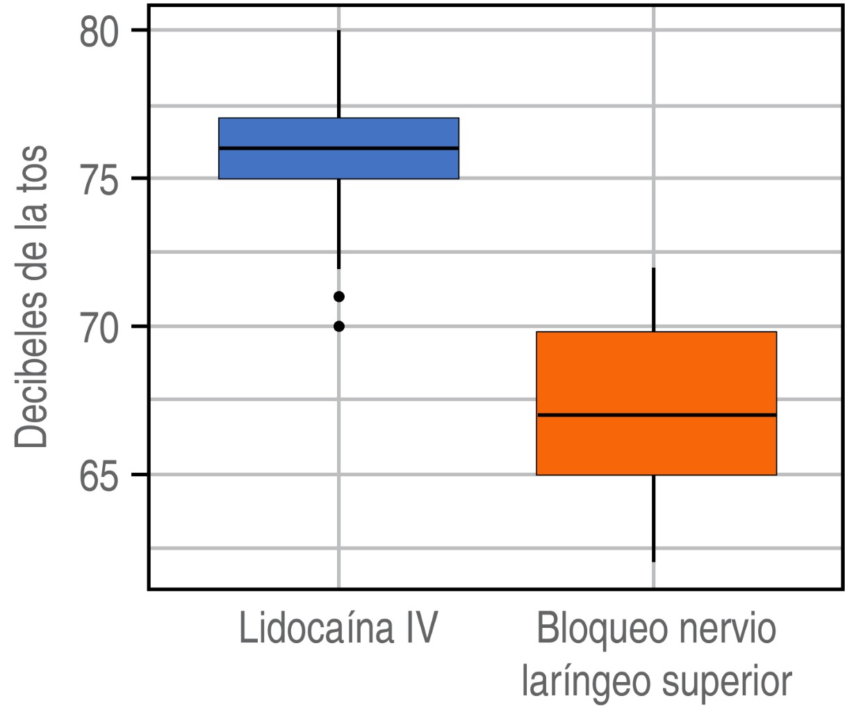 Como objetivo secundario se compararon los decibeles de los pacientes que sí presentaron tos en ambos grupos, se encontró una diferencia estadísticamente significativa (p < 0.0001) entre los grupos, se observó una disminución en los decibeles para el grupo de bloqueo del nervio laríngeo superior, esto pude ser debido a que a través del bloqueo se anestesia directamente la base de la lengua, la zona supraglótica de la laringe, valécula, epiglotis, aritenoides y zona aritenoepiglótica, que al momento de la extubación son manipuladas, por lo tanto los receptores de dolor y presión en dichas zonas no se activan, lo que disminuye la potencia de la tos y, en caso de presentarse, sería menor.