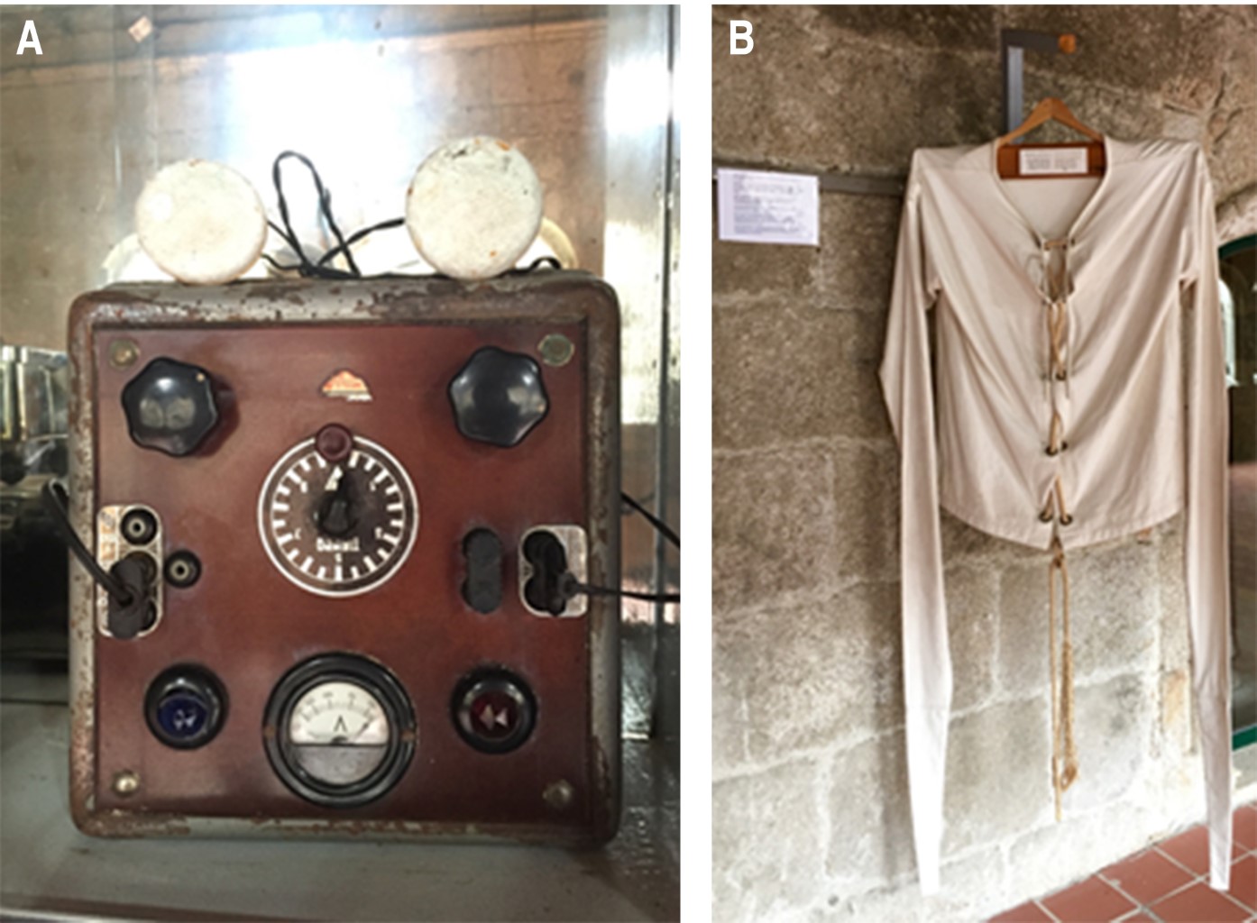 La ECT es una técnica que consiste en un estímulo eléctrico que activa las neuronas del córtex cerebral; fue aplicada inicialmente en la década de los 40 sin anestesia, al coexistir con numerosos problemas técnicos derivados de la utilización de las primeras máquinas (Figura 1A; máquina de ECT de la década de los 40) así como de las consecuencias de la propia actividad convulsiva que generaba unas contracciones musculares enérgicas (con posibles lesiones musculoesqueléticas asociadas(1,2)) que precisaban del empleo de camisas de fuerza (Figura 1B) aparte de otros métodos de contención; y es por eso que a partir de los años 50, con la aparición de nuevos relajantes neuromusculares de corta duración, junto a nuevos hipnóticos, surge la ECT como un procedimiento habitual.