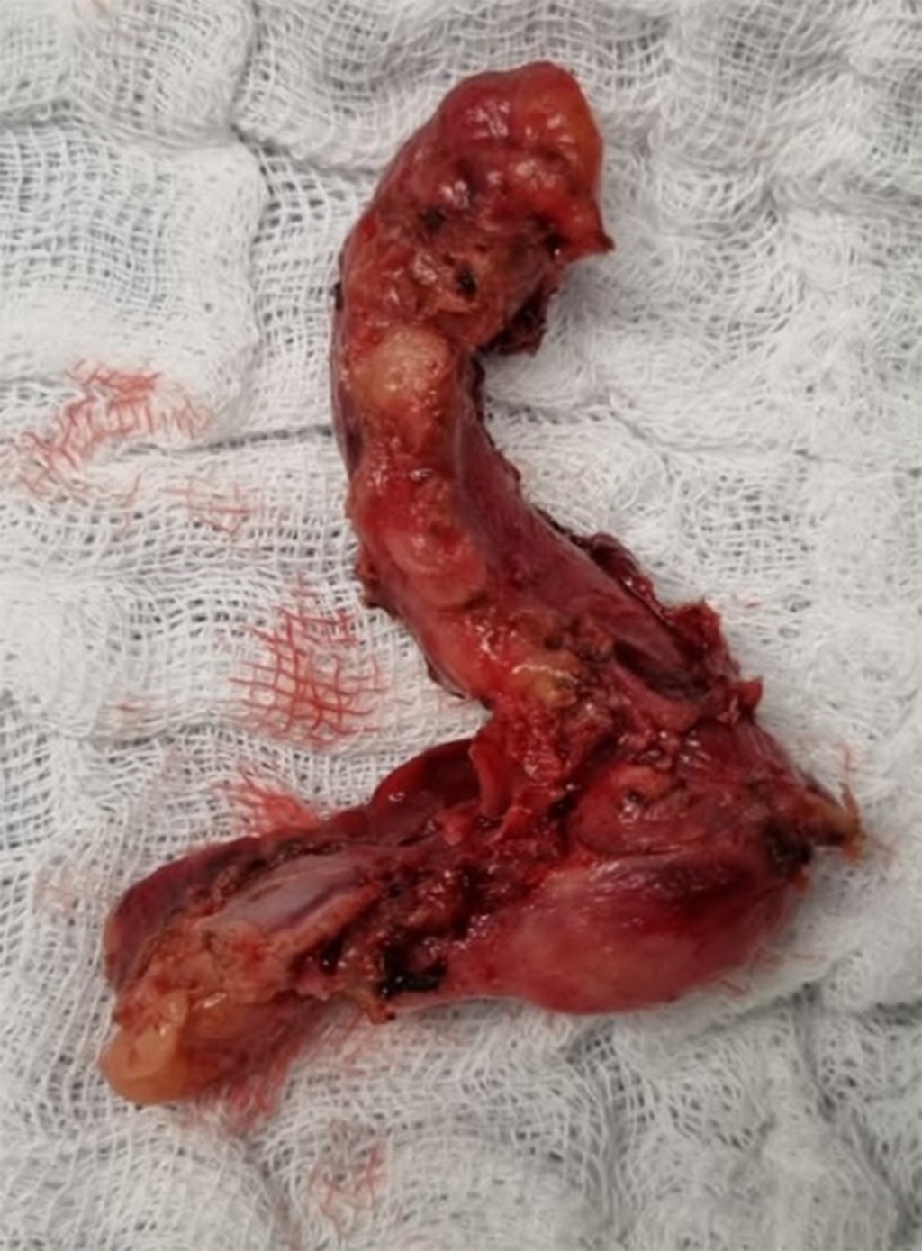 Se realizó un estudio analítico, prospectivo, transversal, comparativo, con una muestra inicial de 86 pacientes, de los cuales se eliminaron seis (por consumo crónico de AINE, drogas, inmunosupresión y diabetes mellitus descontrolada), el tamaño de la muestra fue calculado para proporciones de poblaciones no relacionadas con 40 pacientes por grupo, con una población total estudiada de 80 pacientes, se incluyeron adultos entre 18 y 65 años atendidos en el Nuevo Sanatorio Durango de enero a diciembre de 2020 por sospecha de AA con la escala RIPASA > 7 puntos. A cada paciente se le aplicó un cuestionario con los parámetros evaluados por la escala de RIPASA y con preguntas acerca del consumo previo de AINE. Se estableció un grupo de análisis con terapia farmacológica previa a la valoración médica (TFPVM) y otro sin ella (STFPVM). En todos los pacientes se confirmó el diagnóstico de AA mediante estudios de imagen o los hallazgos en la exploración quirúrgica (Figura 1) complementada por el estudio de histopatología. Los datos fueron analizados con estadística descriptiva, medidas de tendencia central, de dispersión, distribución y cuartiles. La distribución se exploró con Shapiro-Wilk y se contrastó hipótesis con tabla de contingencia y prueba de χ2, la significancia se expresó en valor p < 0.05.
