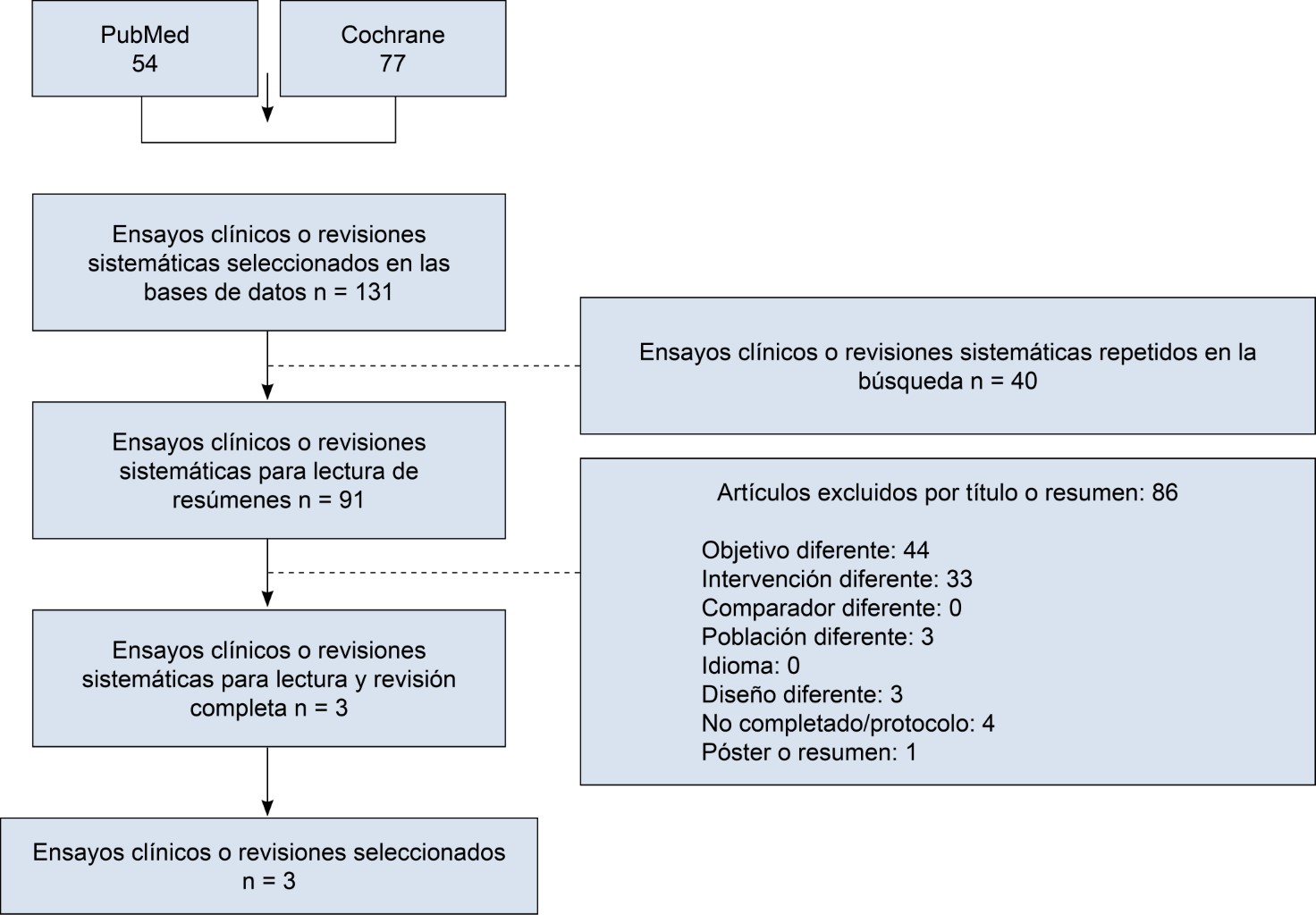 Inicialmente se encontraron 131 artículos, se eliminaron 40 repetidos y 86 en la fase de lectura de resúmenes, quedando tres estudios con los criterios de búsqueda, como se muestra en el algoritmo PRISMA en la Figura 1. En la Tabla 2 se muestran las características de los estudios incluidos y en las Tablas 3, 4 y 5 se detallan los resultados.