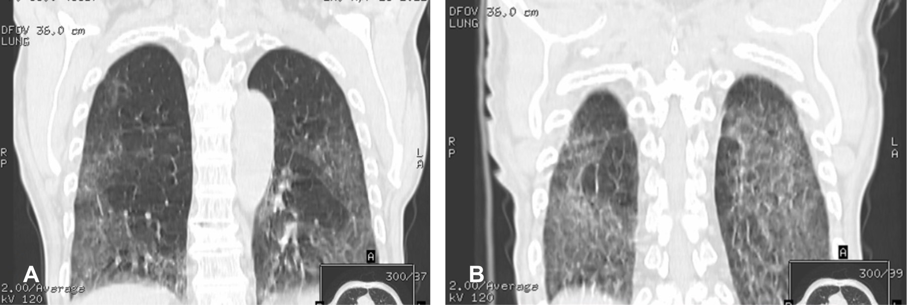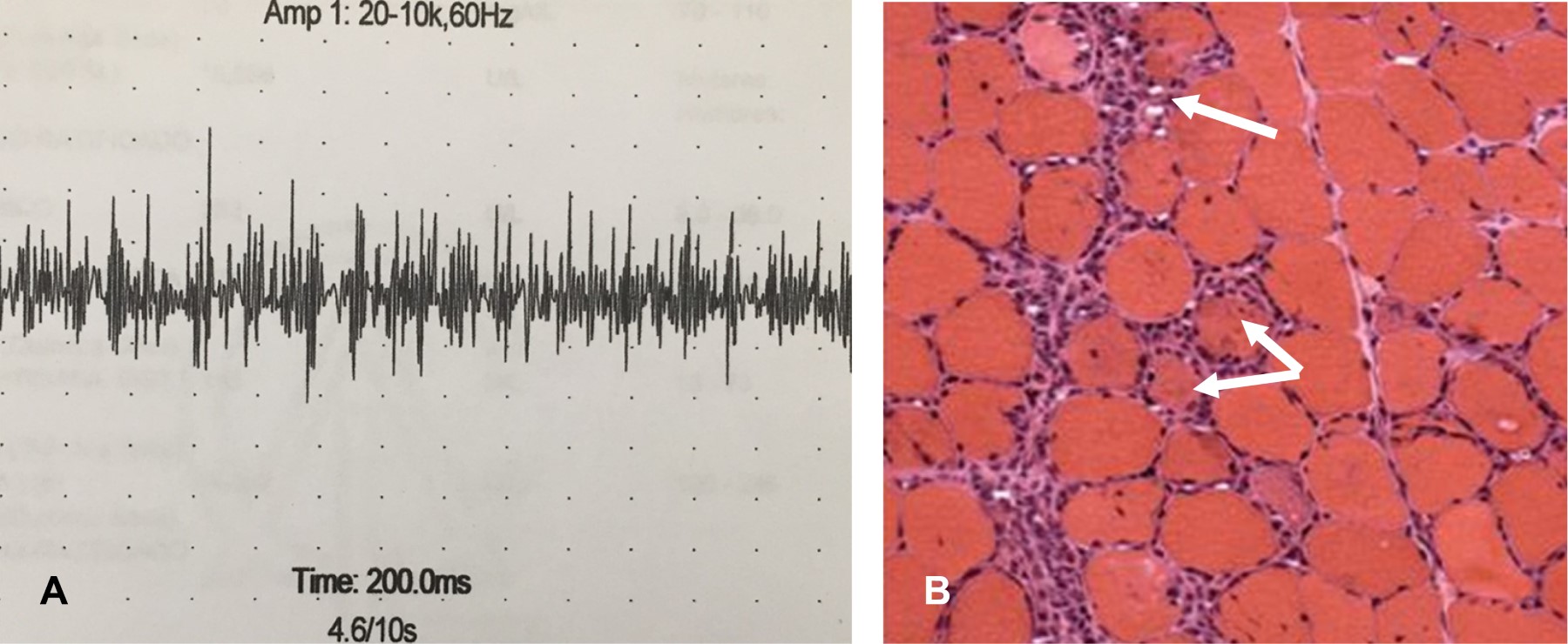 Con diagnósticos de: probable miopatía y neumopatía intersticial. El laboratorio mostró: glucosa 76 mg/dL; CPK total 3,586 U/L; TGO 252 U/L; TGP 278 U/L, GGT 133 U/L; DHL 4, 239 U/L y anticuerpos anti-Jo-1 positivos a 32 EU/mL; anti-ARS negativos; la electromiografía con fibrilaciones y ondas positivas, potenciales polifásicos de baja intensidad y baja amplitud en deltoides y glúteo mayor (Figura 3A); confirmando diagnóstico de polimiositis, con biopsia deltoidea (Figura 3B). Prescribiendo 60 mg de prednisona/día; inhibidor de bomba de protones, calcio, vitamina D y programa de rehabilitación. A tres semanas de tratamiento, se desteta collarín, con músculos en calificación 4/5 con marcha independiente.