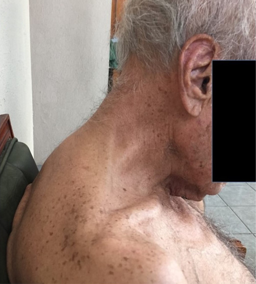 Hombre de 76 años. Inicia hace ocho meses con: debilidad creciente en paravertebrales cervicales y músculos de cintura escapular y pélvica, pérdida de 12 kg, cuenta con endoscopia de tubo digestivo alto y bajo normales y tomografía computarizada (TC) de tórax, mostrando neumopatía intersticial (Figura 1). A la exploración: tensión arterial 110/60 mmHg; frecuencia cardiaca 84/min; frecuencia respiratoria 24/min; temperatura 36.6 oC; peso 60 kg; talla 177 cm; índice de masa corporal 19.2. Oximetría de 90. Postura: columna cervical en flexión con barbilla pegada al tórax y cifosis dorsal; marcha asistida con aumento en base de sustentación; cuello en flexión con barbilla en pecho (Figura 2), paravertebrales cervicales en 1/5. Extremidades: calificación 3/5 para músculos de cintura escapular y pélvica, resto en 5/5.
