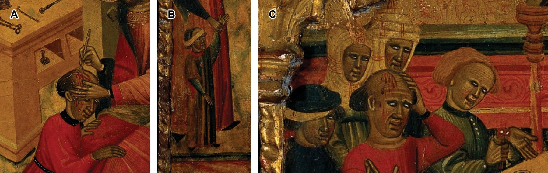 En cuanto a la pintura que representa a San Lucas, motivo de esta comunicación (Figura 1), podemos mencionar que existen controversias sobre su autoría, atribuyéndose al español Juan de Sevilla;2 realizada entre 1401 a 1435, pintada con la técnica al temple sobre tabla, mide 95 cm de alto por 55 cm de ancho. Se encuentra en el Museo del Prado, desafortunadamente, la pieza no está exhibida al público; fue adquirida por la junta superior del tesoro artístico en 1928. Los expertos la han catalogado dentro del gótico internacional, corriente derivada de la pintura bizantina, pero con características un poco distintas.3 El autor realizó una obra llena de misticismo en la que cada pieza tiene un significado, en el análisis de la pintura se observa a San Lucas como personaje central, mostrando una escena de la vida real, sentado en un banco de madera, realizando un procedimiento médico quirúrgico,3 ensimismado en su labor; el evangelista está vestido a la usanza de su época, con una capa roja (color que representa la búsqueda del conocimiento) y una túnica naranja (que implica el trabajo místico); lleva una aureola, en forma de almendra, que expresa una energía sobrenatural radiante y luminosidad espiritual,1 relacionada con Cristo, siendo también una reminiscencia del culto al sol; llama la atención la oreja de San Lucas (símbolo de la comunicación, el aliento vital, la memoria y el equilibrio).4 San Lucas atiende a un niño, se infiere por el tamaño del personaje representado (en esa época las formas y tamaños de los niños era difícil de representar, por lo que es una constante en las características de la pintura bizantina). San Lucas tiene en la mano derecha un bisturí o cuchillo (símbolo de curación) y está realizando una incisión en piel en la línea media de la cabeza, brotando sangre de la herida. Probablemente aplicó algún anestésico sobre la piel, ya que el paciente se muestra tranquilo (Figura 2A).4 Se aprecia una delimitación en los espacios mostrados que están separados por un mueble o una mesa. El primer espacio es en donde está trabajando San Lucas y en el otro están los demás pacientes, esperando su turno para ser atendidos. Sobre la mesa se encuentran los instrumentos de San Lucas: unas tijeras (simbolizando la vida y la muerte),5 una pinza, un gancho y un disector que son los atributos de un cirujano, además de tres recipientes con sustancias y ungüentos utilizados como tratamiento, probablemente aceite, miel y algún bálsamo anestésico compuesto de opio y beleño. En el mueble se observan cuatro nichos o espacios en donde aparece un candelabro (símbolo de la luz espiritual y de la salvación).