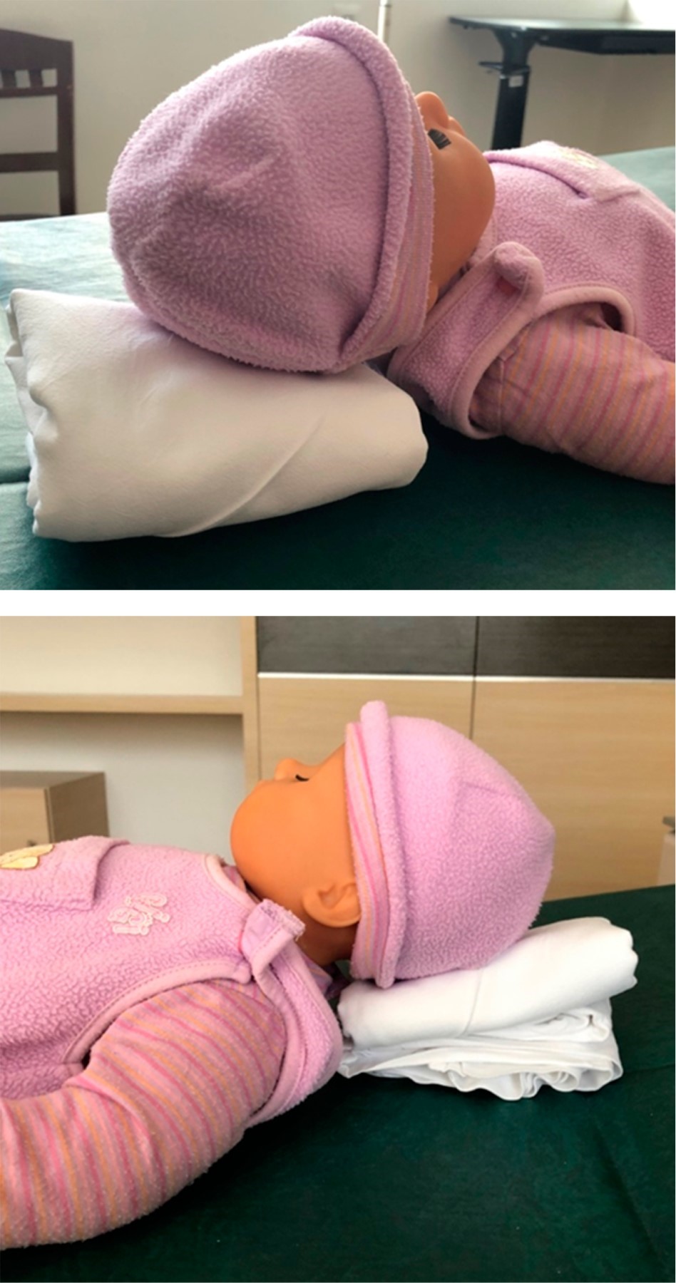 Estas recomendaciones constan de una serie de ejercicios que pueden realizar los padres desde el nacimiento para prevenir esta alteración craneal. Hay que fomentar la alternancia de posición de la cabeza para que no se encuentre la mayor parte del tiempo reclinada en solo un lado (Figura 1). Cuando el bebé esté despierto, colocar bajo vigilancia en posición decúbito prono para fomentar el fortalecimiento de los músculos cervicales (Figura 2).
