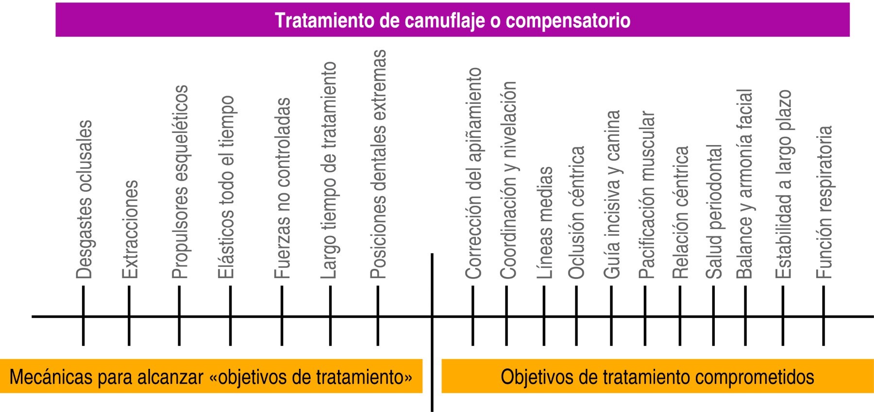 Hablando de tratamientos de camuflaje o compensación, es posible referirse también a situaciones en las que debe decidirse si se hacen o no extracciones, se inicia o no el tratamiento a edades tempranas, se aplican o no rellenos sintéticos faciales, etcétera. Es necesario cuestionarse hasta dónde este tipo de tratamientos dejan de cubrir los requerimientos mínimos de función, estética y estabilidad.3