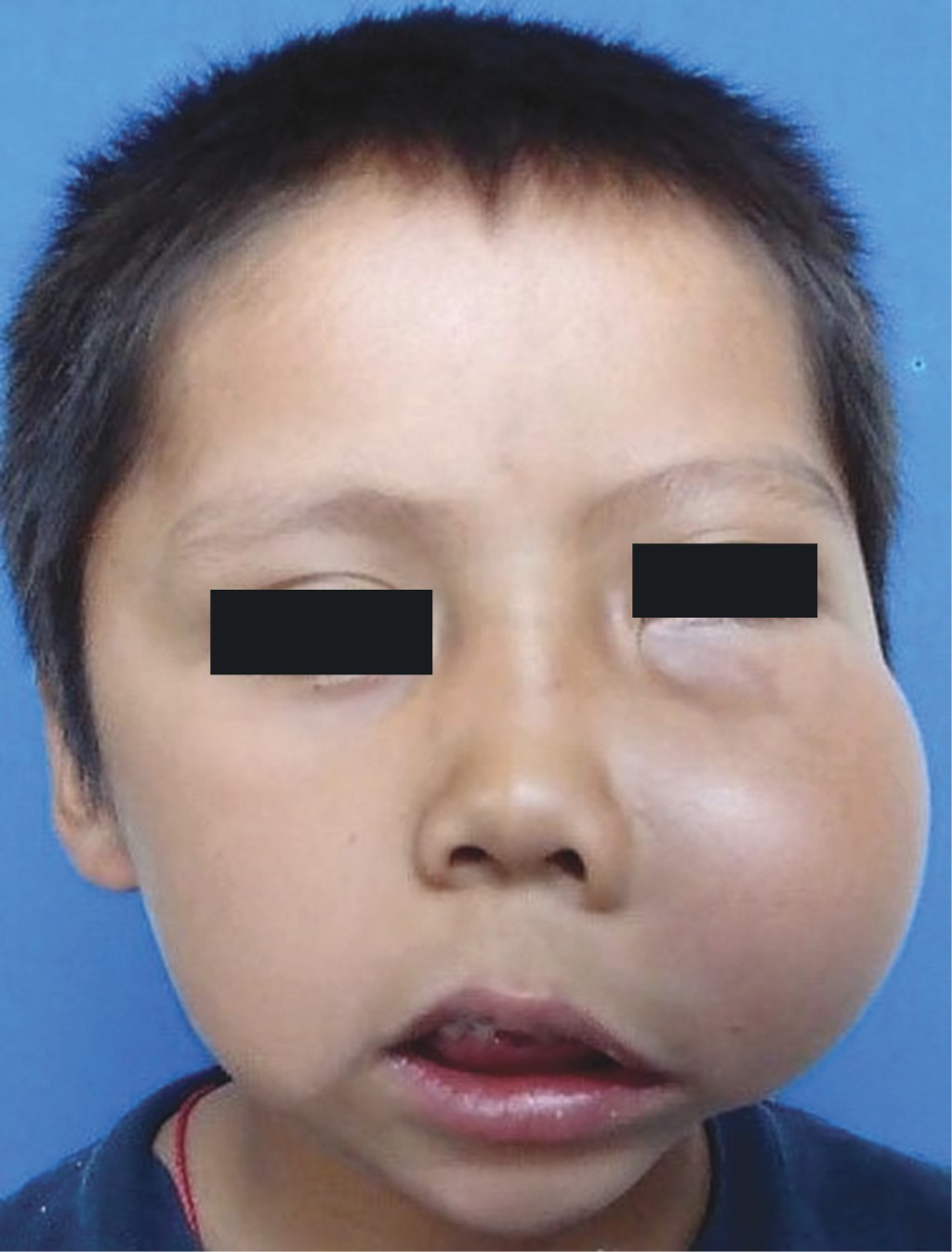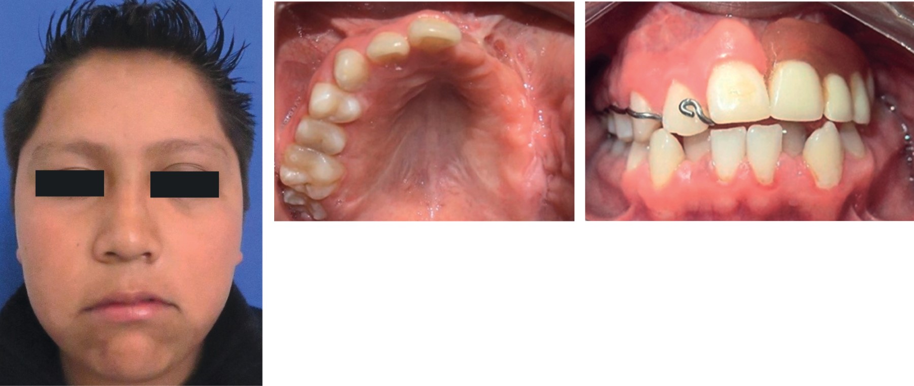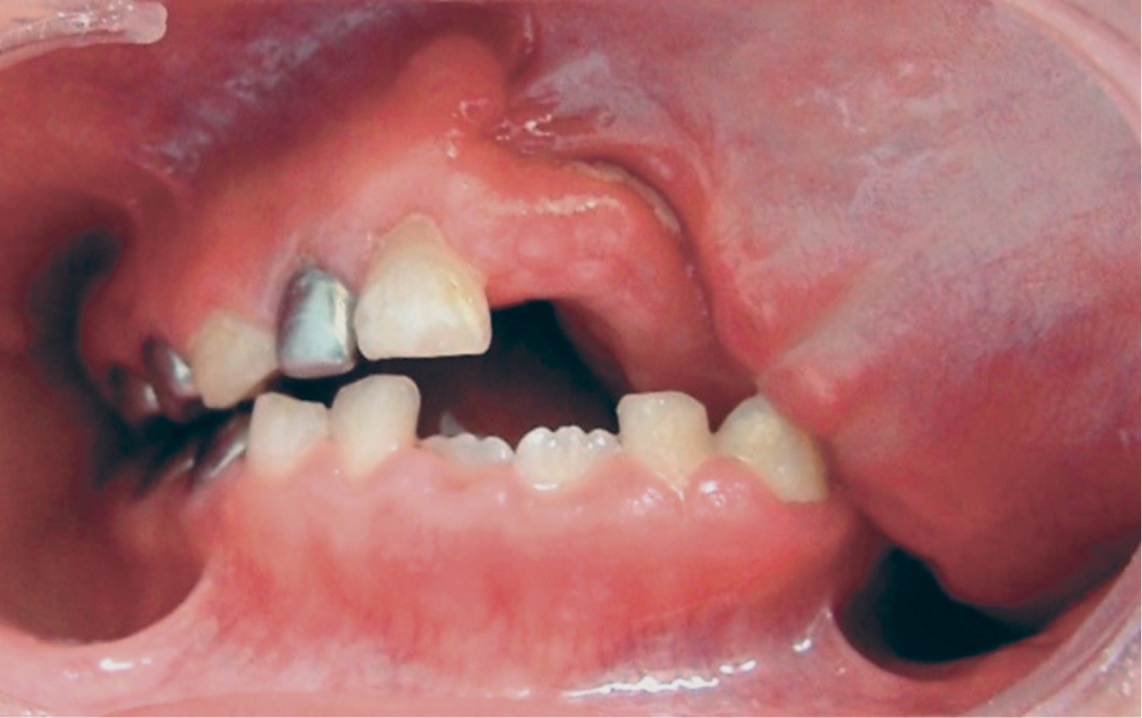 Inicia su padecimiento en el mes de marzo de 2007, cuando presenta aumento de volumen en la región maxilar y malar del lado izquierdo. Es valorado en primera instancia por un facultativo del Hospital del Niño Poblano, donde realizan manejo quirúrgico inicial de resección de la lesión en el mes de agosto del mismo año. Cursa con una evolución aparentemente adecuada; sin embargo, en diciembre de 2008 presenta nuevamente aumento de volumen en la misma región, por lo que es referido al Servicio de Cirugía Maxilofacial del Instituto Nacional de Pediatría. Se valora el paciente masculino de seis años de edad que a la exploración física presenta importante aumento de volumen, de aproximadamente 10 cm de diámetro, que involucra las regiones maxilar y malar del lado izquierdo y condiciona una asimetría facial importante, así como limitación de la apertura palpebral ipsilateral (Figura 1), no doloroso a la palpación, de consistencia firme, no móvil, con tegumentos sin cambios de coloración. Intraoralmente, observamos aumento de volumen del maxilar del lado izquierdo con pérdida del fondo de repliegue mucogingival anterior y posterior del lado izquierdo, de consistencia firme, con presencia de úlceras traumáticas en la zona posterior a expensas de contacto oclusal con órganos dentarios antagonistas (Figura 2).