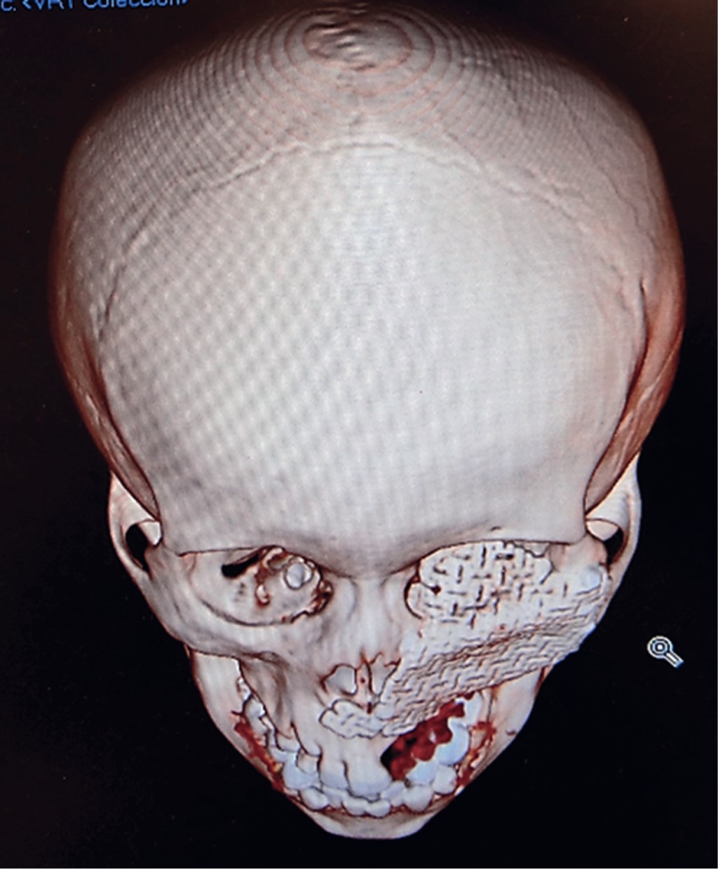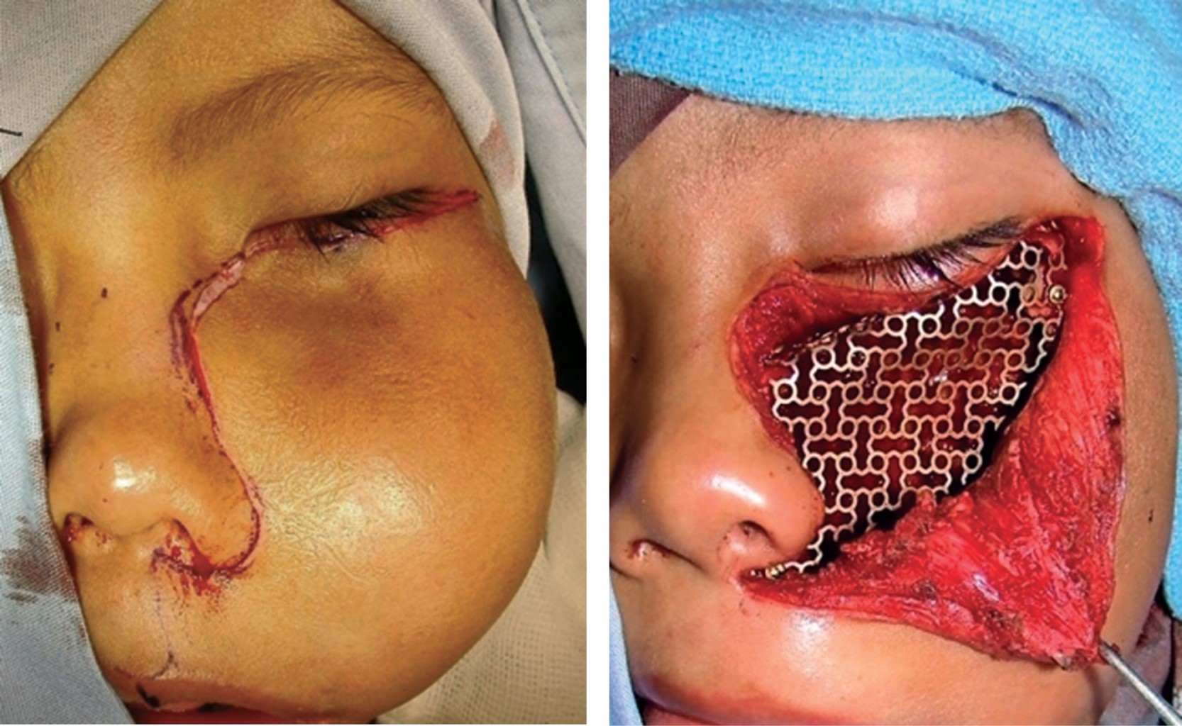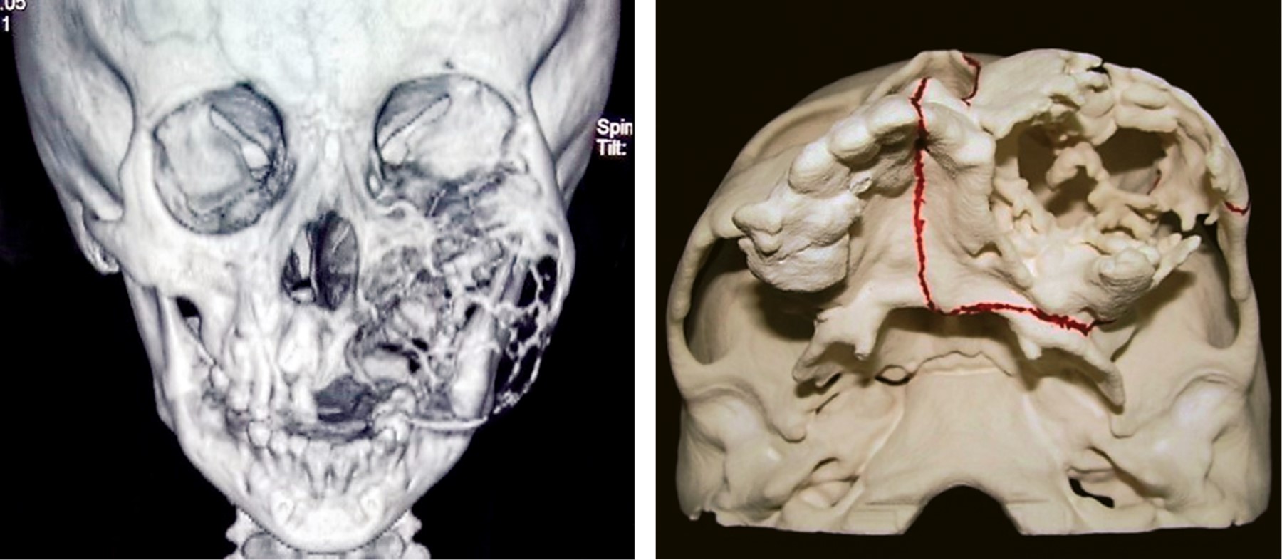Se toma la biopsia incisional, así como por punción, del contenido de la lesión, en donde se reporta contenido hemático con fragmentos de tejido óseo con actividad osteoclástica y fragmentos de pared de quiste con proliferación fibroblástica, osteoclastos y depósitos de osteoide, compatibles con diagnóstico de quiste óseo aneurismático. Se realizan estudios prequirúrgicos habituales, así como tomografía computarizada con reconstrucción 3D y estereolitografía para la planificación quirúrgica (Figura 3). Se programa para tratamiento quirúrgico bajo anestesia general en octubre de 2008. Debido a la localización y extensión de la lesión, se decide llevar a cabo maxilectomía mediante un abordaje tipo Weber-Ferguson modificado, con colocación de material de osteosíntesis para reconstrucción maxilar tras realizar la hemimaxilectomía (Figura 4). La muestra obtenida de la lesión es enviada para su estudio histopatológico, que reporta fragmentos de tumor de 38 g de peso, irregulares, laminares, de color café, con coágulos sanguíneos asociados con fragmentos de hueso café claro, duro y poroso, con diagnóstico de quiste óseo aneurismático.