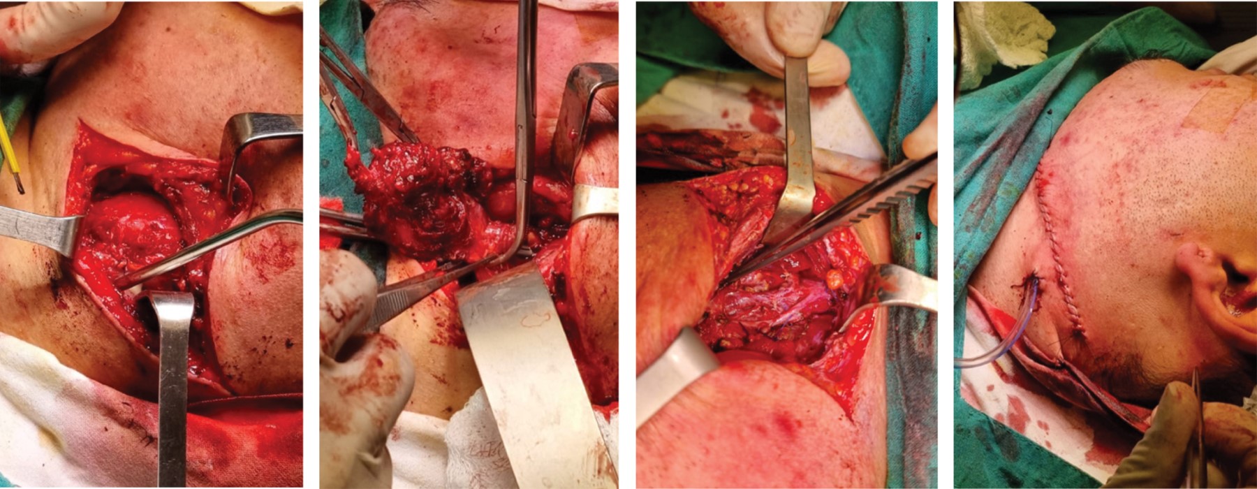 En pabellón central, bajo anestesia general, se realiza colgajo compuesto abarcando región cervical y parte de borde mandibular. Se efectúa ingreso a fascia superficial, rechazando músculo esternocleidomastoideo y estructuras vasculares (Figura 2).