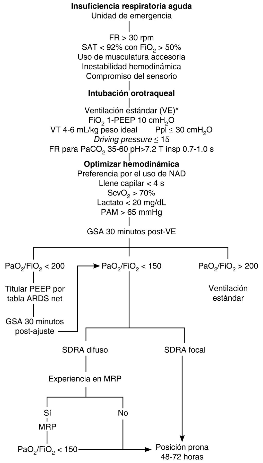 La VMI con una estrategia de pulmón abierto (OLA [open lung approach]) no ha demostrado disminuir la mortalidad, sólo consigue mejorar la oxigenación y reducir la DP, sin producir barotrauma ni incrementos en la mortalidad.34 Otros trabajos aleatorizados que comparan altos niveles de PEEP versus PEEP ajustado según la tabla ARDS Network,22 sólo han demostrado disminuir la estancia en la VMI, la duración de las disfunciones orgánicas y la necesidad de soporte ventilatorio extraordinario.35