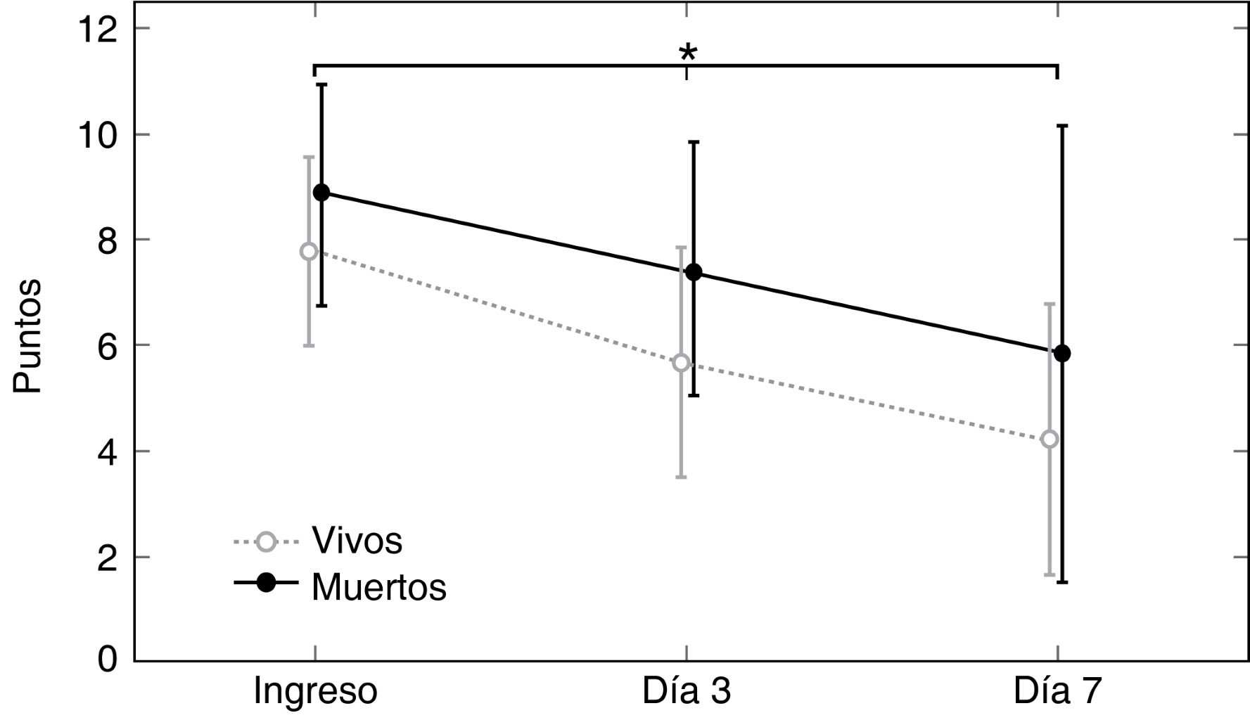 La ferritina, dímero D y lactato deshidrogenasa (LDH) al ingreso fueron: 1,737.3 ± 1,218.2; 3.9 ± 10.2 y 445.3 ± 178.5 respectivamente; siendo sólo la LDH estadísticamente diferente entre vivos y muertos 416.1 ± 156.3 versus 575.1 ± 215.7 (p = 0.0019). El puntaje de SOFA siempre fue menor en los pacientes que permanecieron en PS (Figura 2).