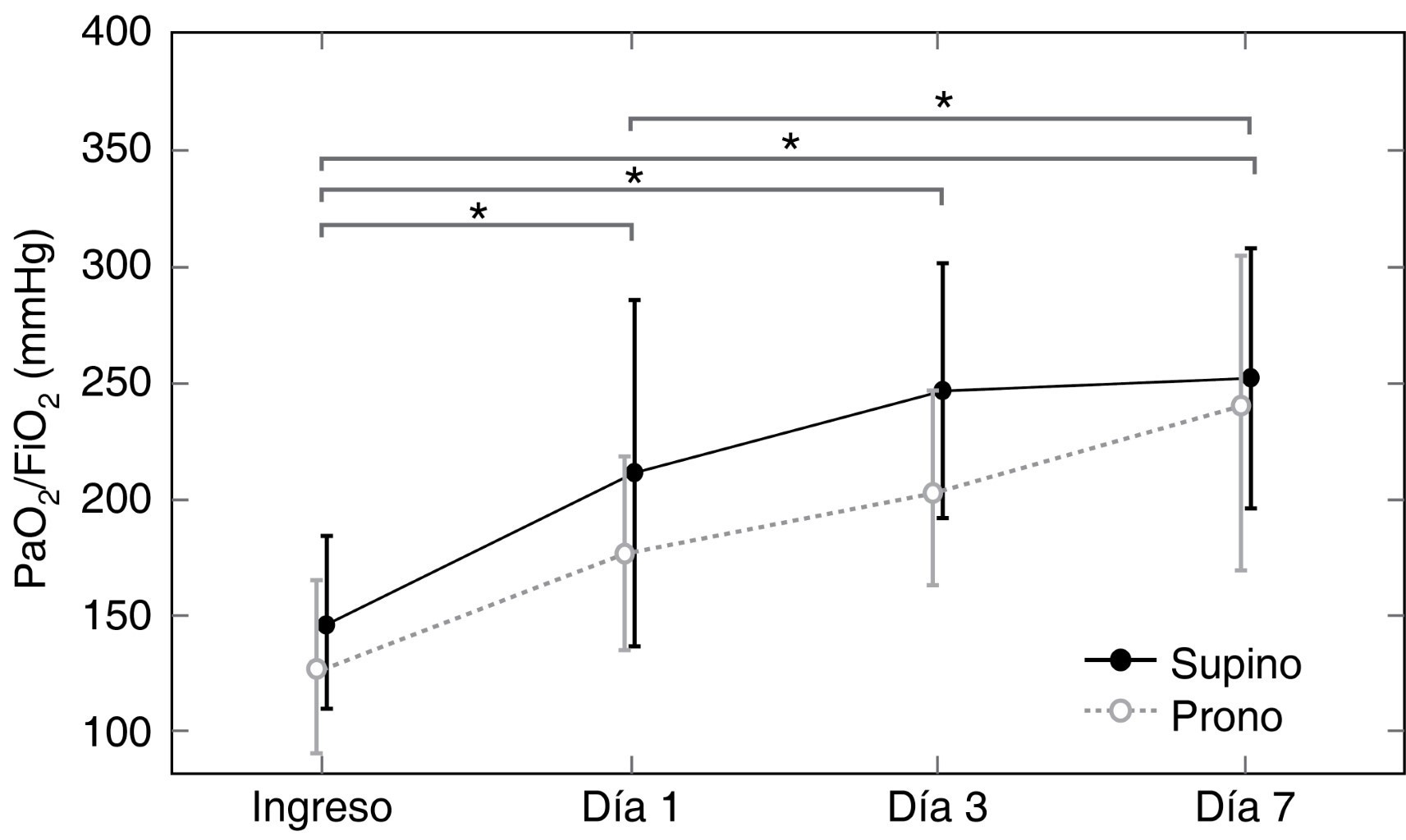 El promedio de PaO2/FiO2 en los pacientes que permanecieron en PS fue mayor y estadísticamente diferente que en pacientes en PP, al ingreso y durante los días tres y siete (Figura 3).